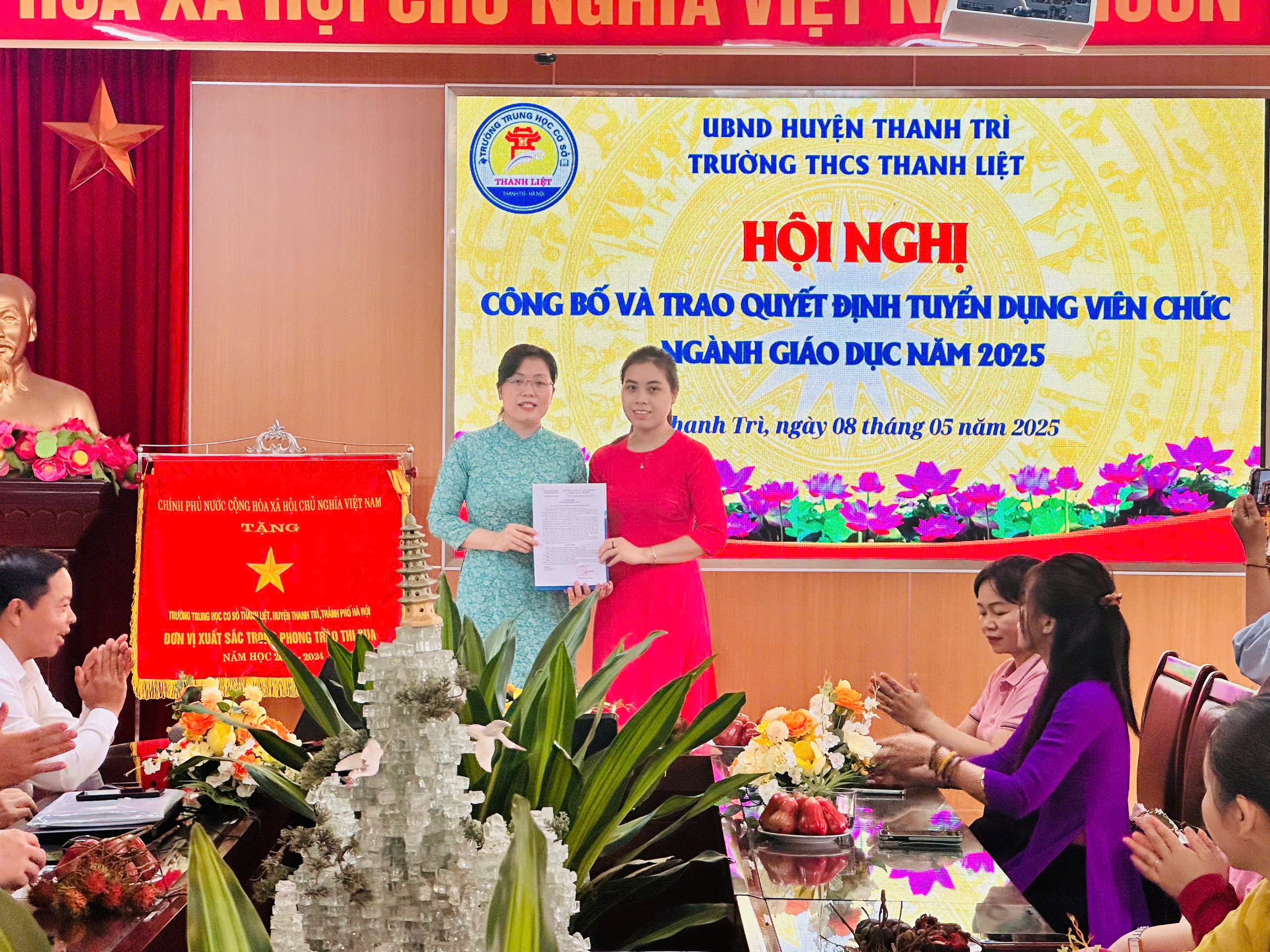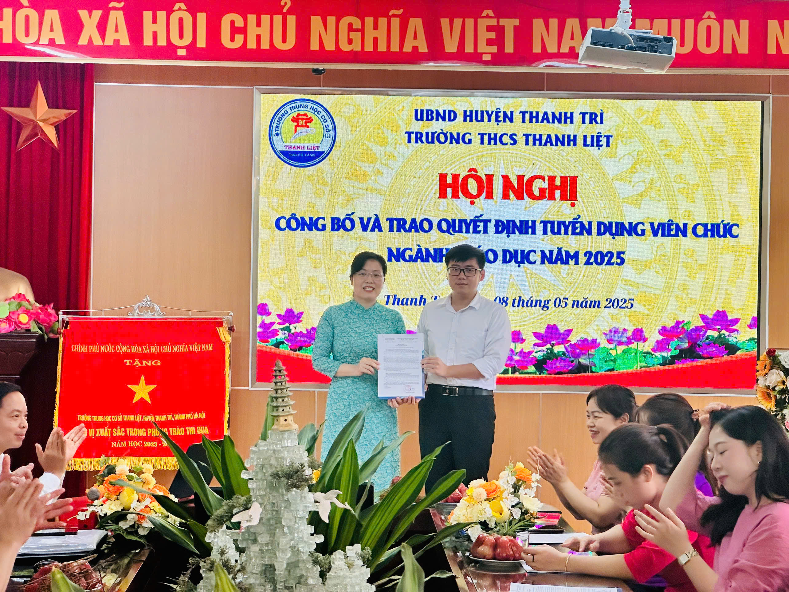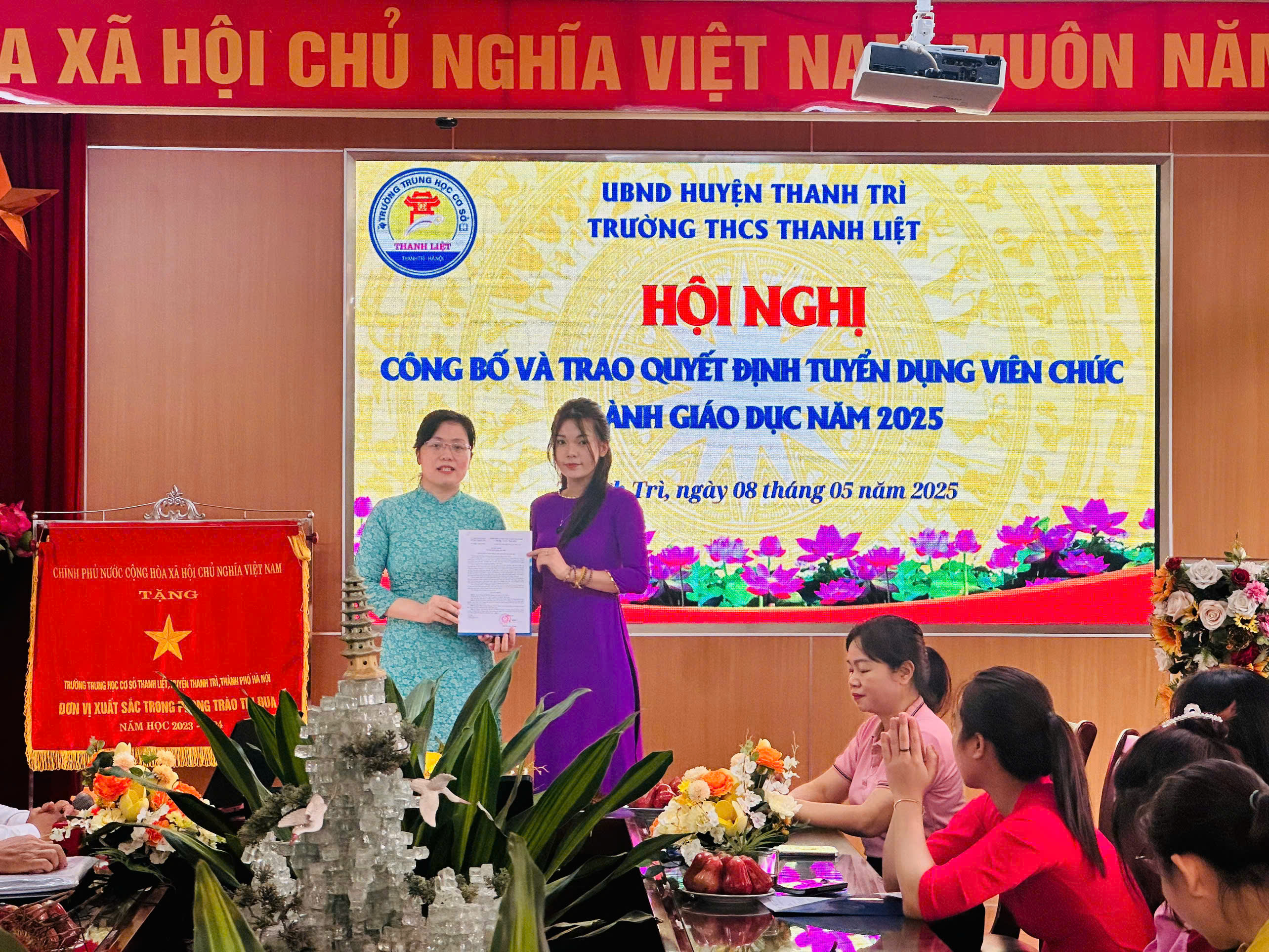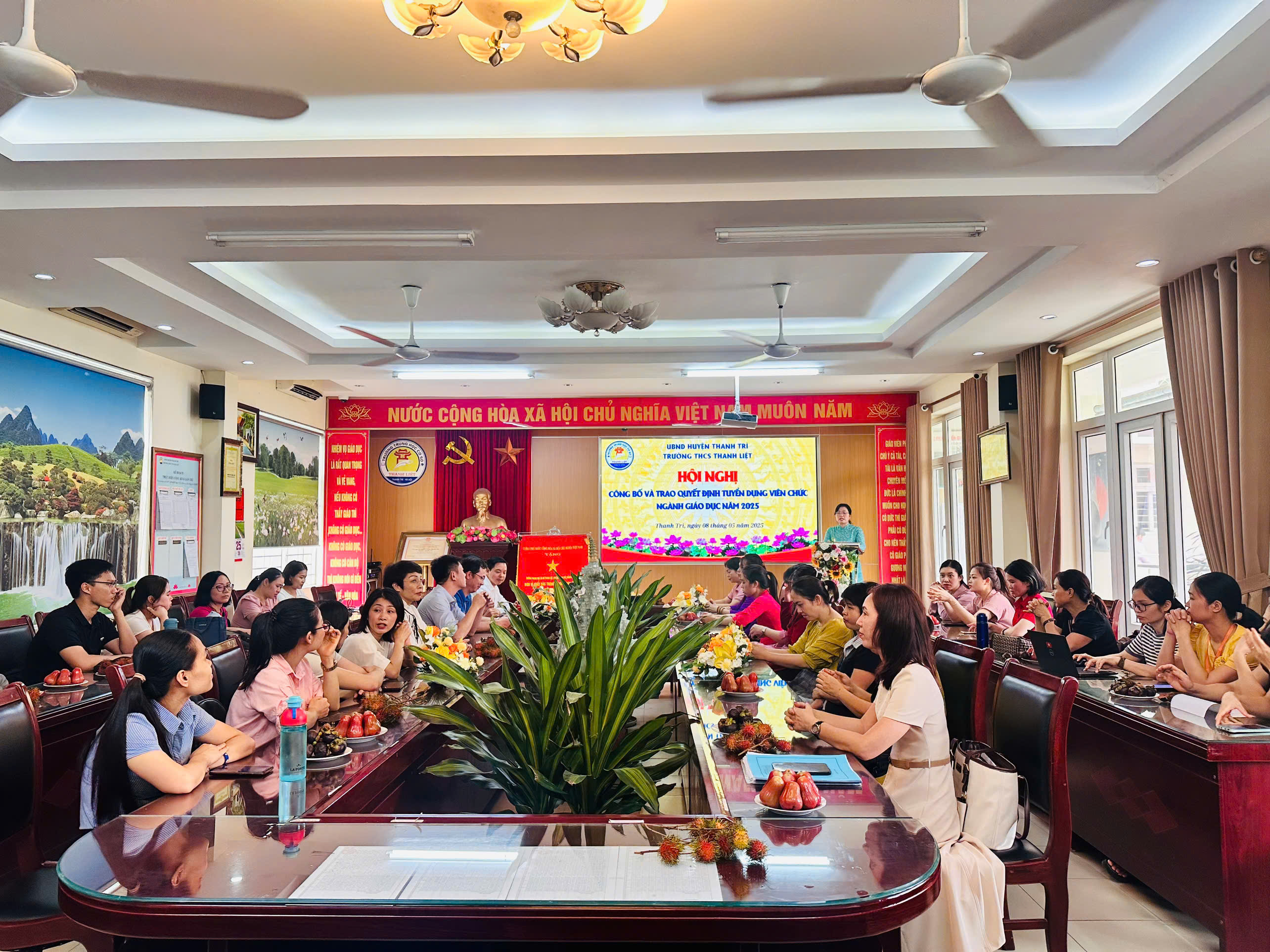 Thực hiện hướng dẫn của Phòng Nội vụ Huyện Thanh Trì về việc công bố trao quyết định cho các thí sinh trúng tuyển viên chức làm việc tại cơ sở giáo dục công lập trực thuộc UBND huyện Thanh Trì năm 2025, sáng này 08/05/2025 Trường THCS Thanh Liệt tổ chức Hội nghị công bố và trao quyết định cho các thí sinh trúng tuyển viên chức làm việc tại nhà trường.