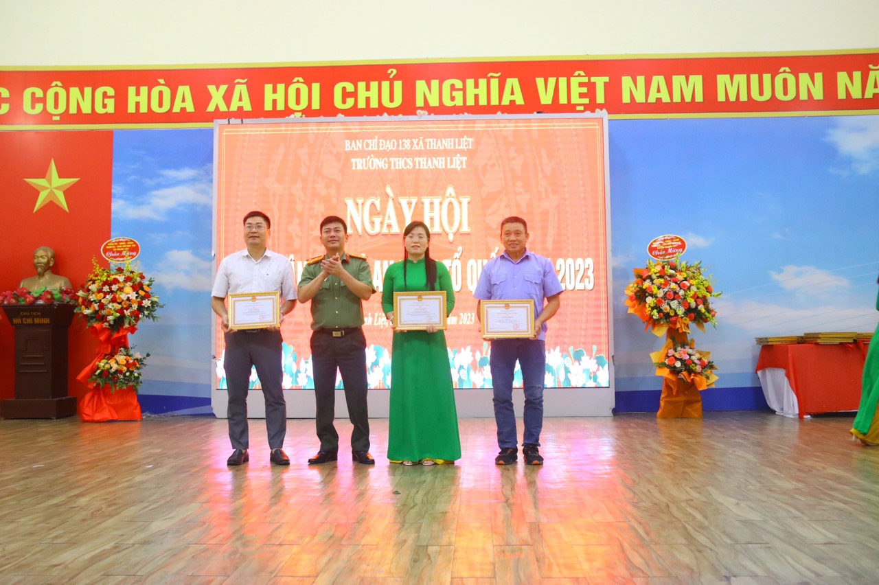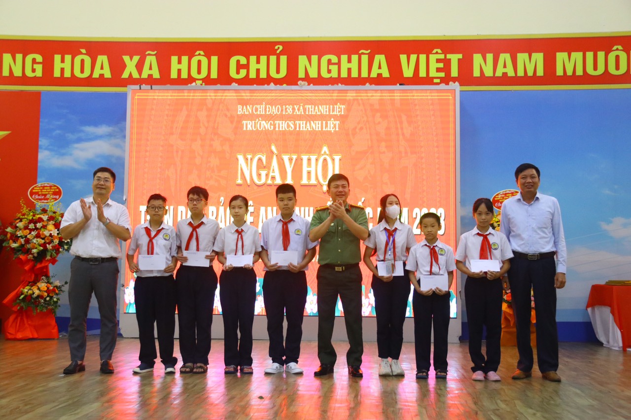 Nhân dịp này đồng chí Thượng tá Nguyễn Công Lương đã trao giấy khen cho tập thể và 05 cá nhân trường THCS Thanh Liệt vì có thành tích xuất sắc trong phong trào “Toàn dân bảo vệ ANTQ” và trao quà cho 7 em học sinh có hoàn cảnh khó khăn vươn lên đạt thành tích cao trong học tập.