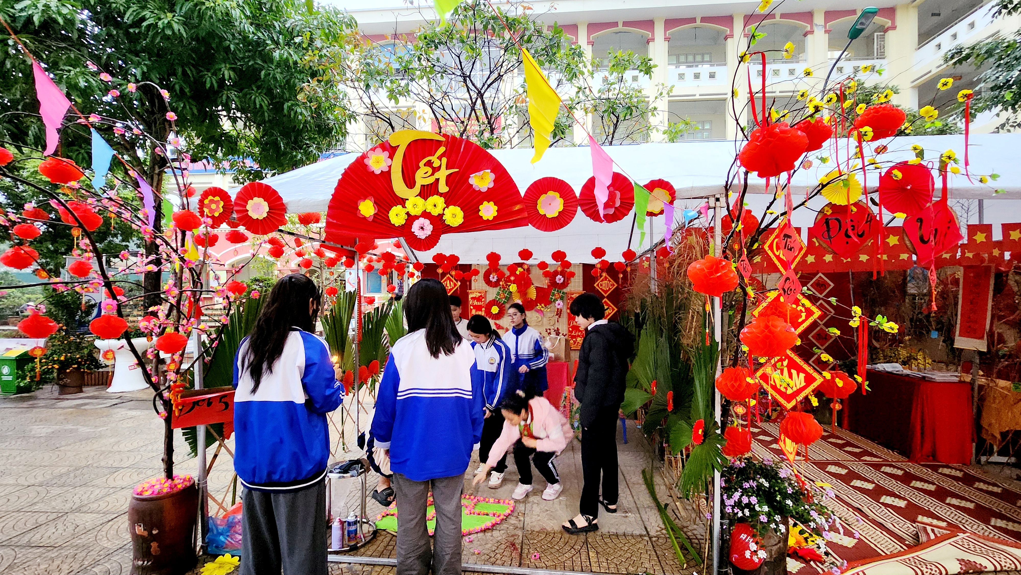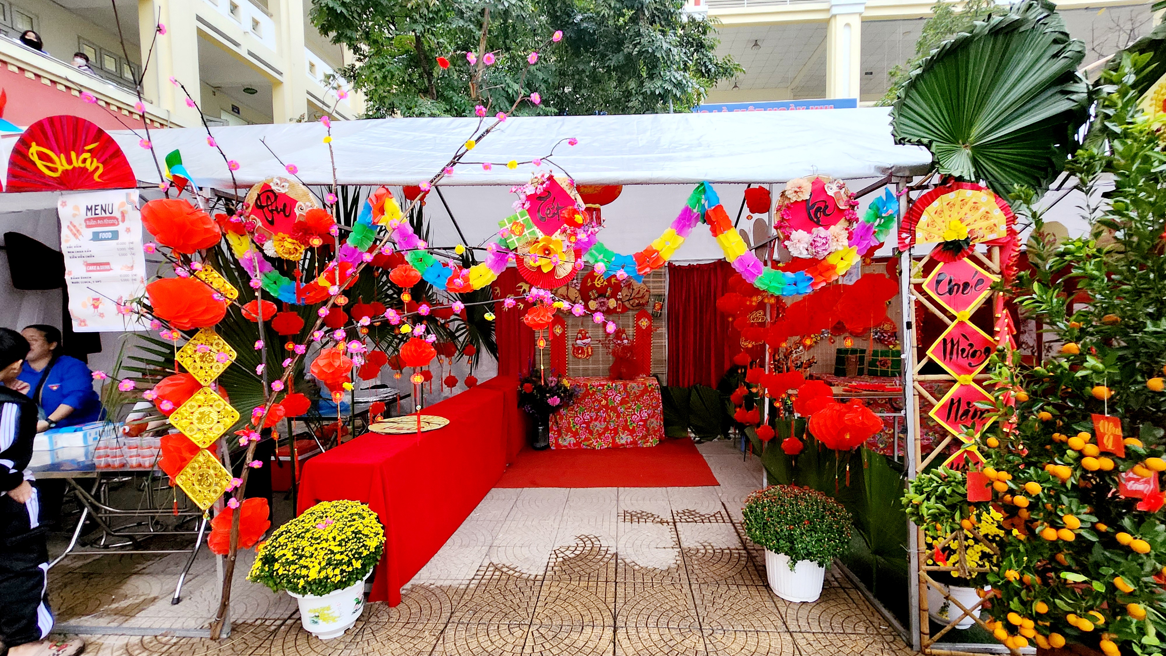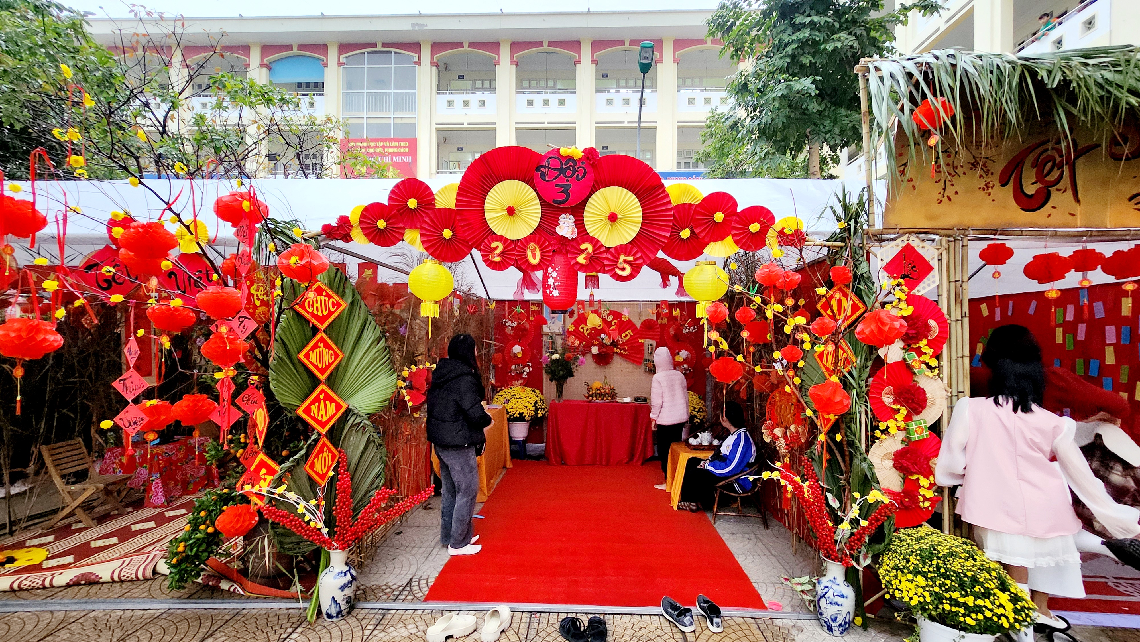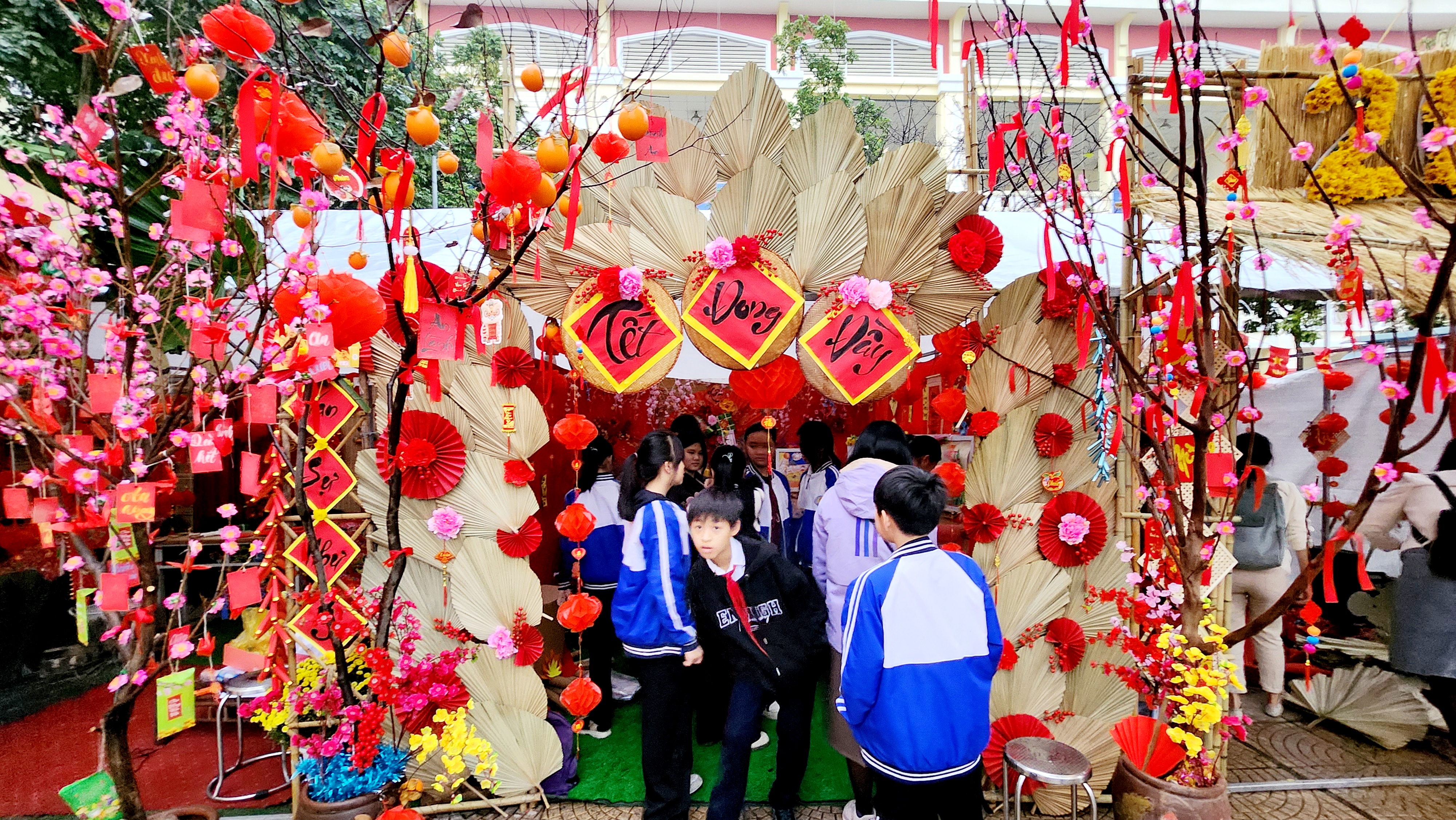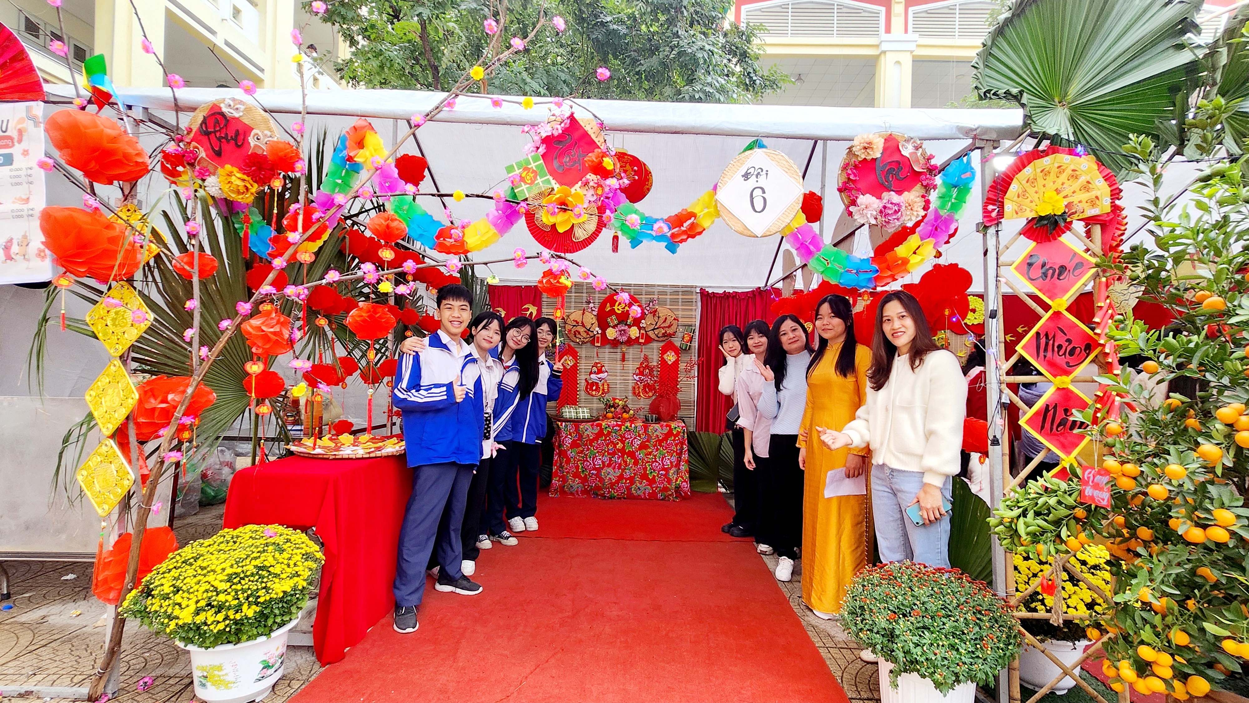 Cũng trong ngày hội xuân, các em học sinh còn được tham gia cùng các thầy cô giáo và các nghệ nhân trong hoạt động gói bánh chưng truyền thống, trang trí cành đào ngày tết.
