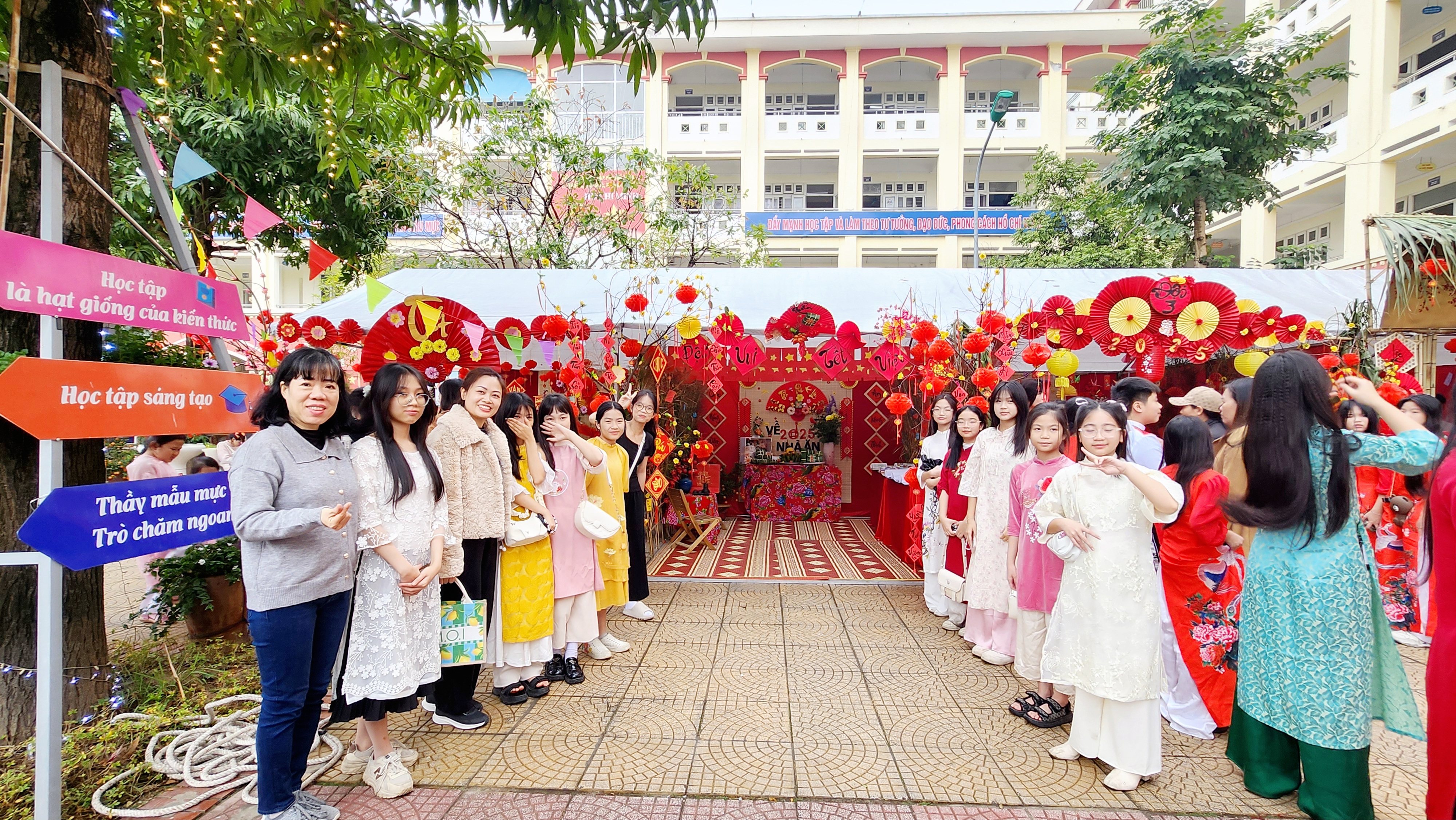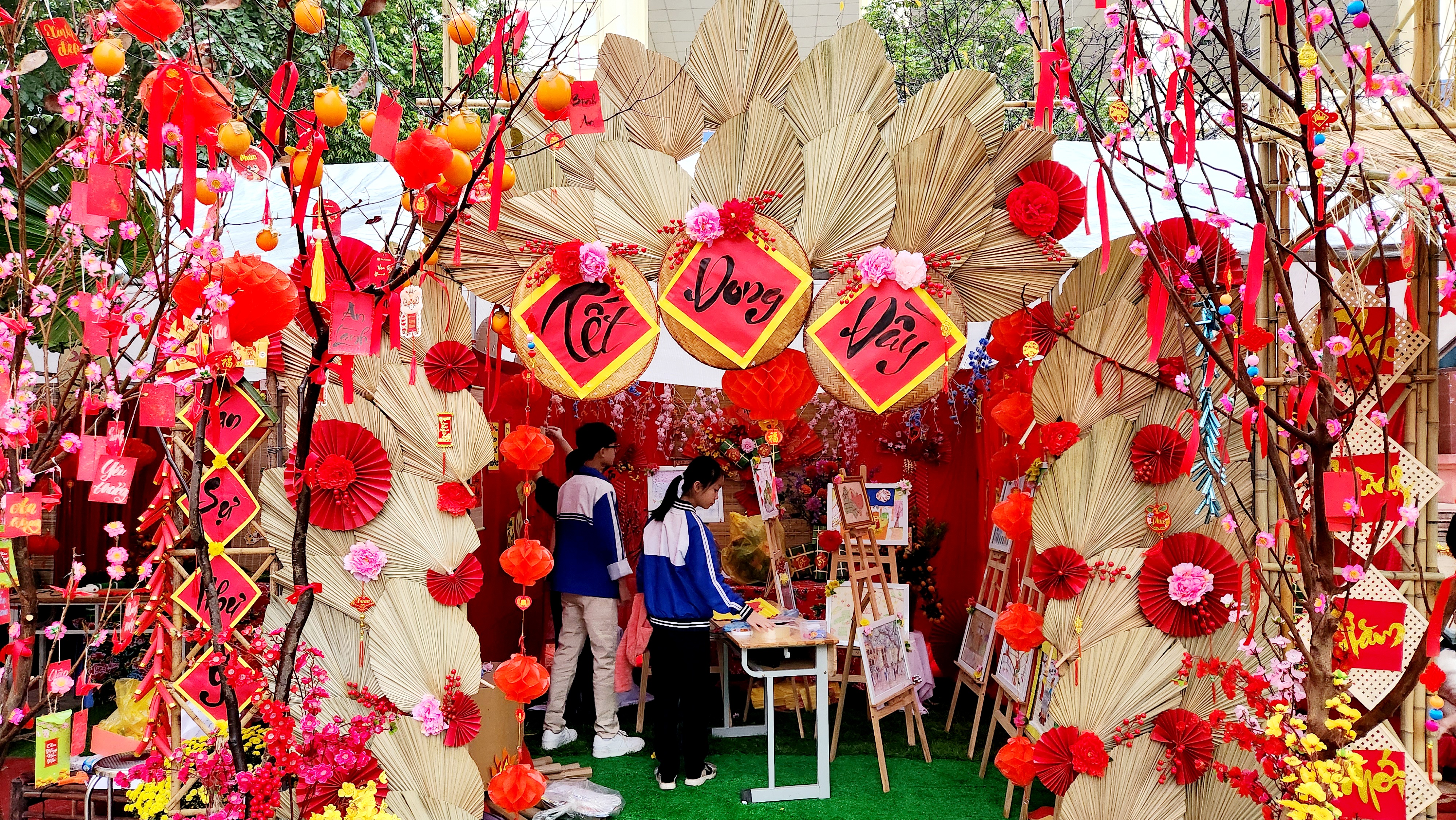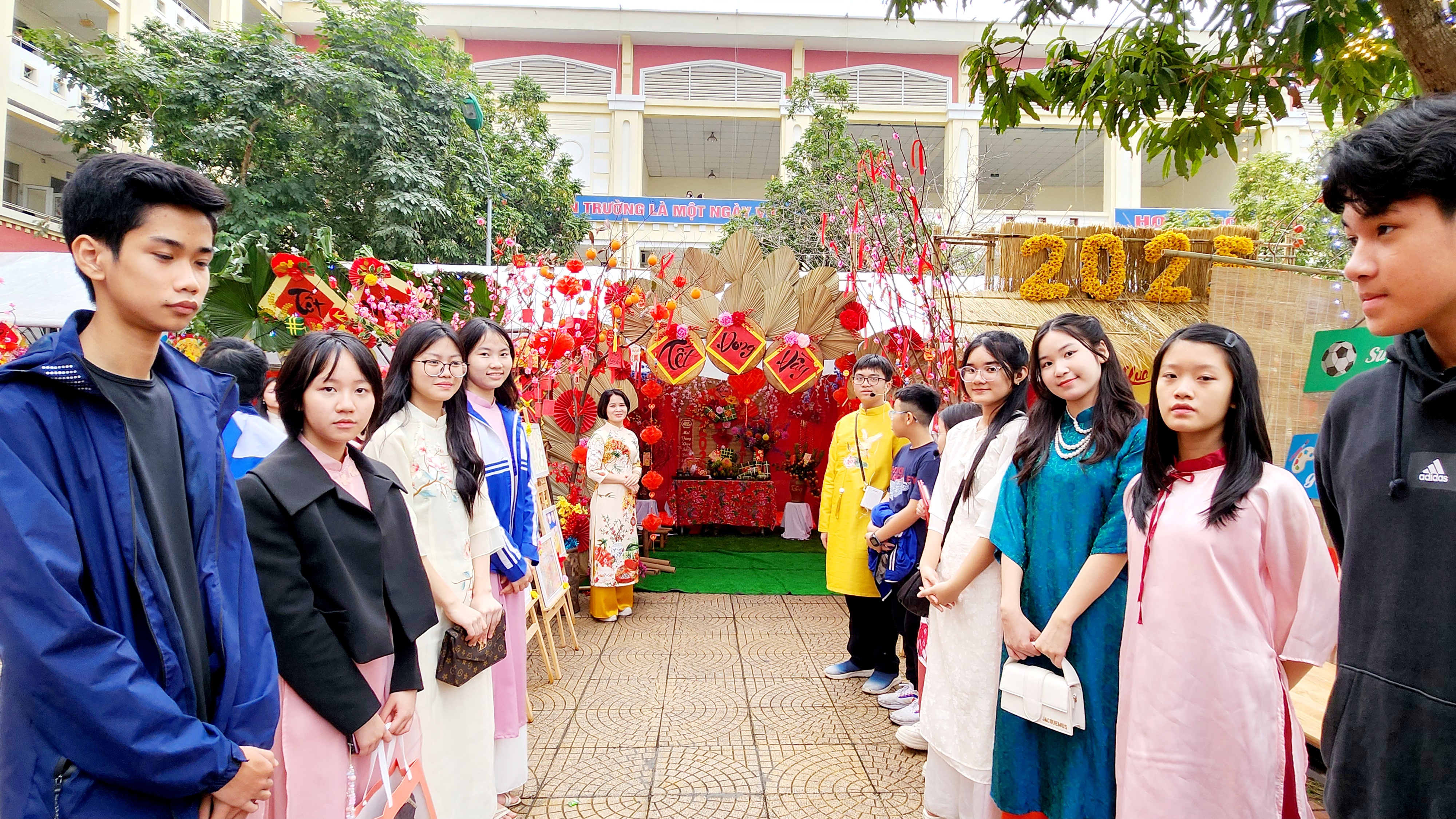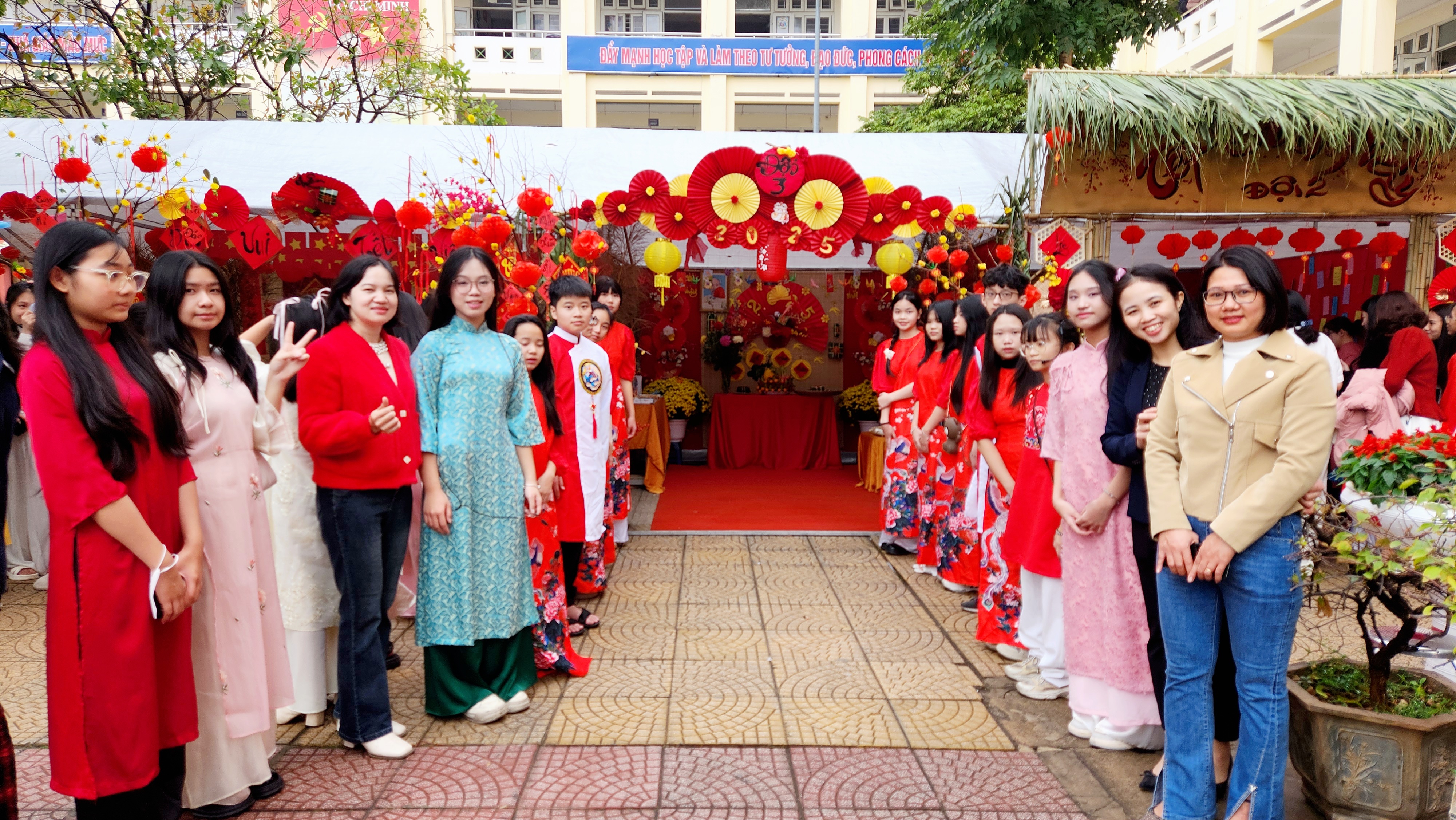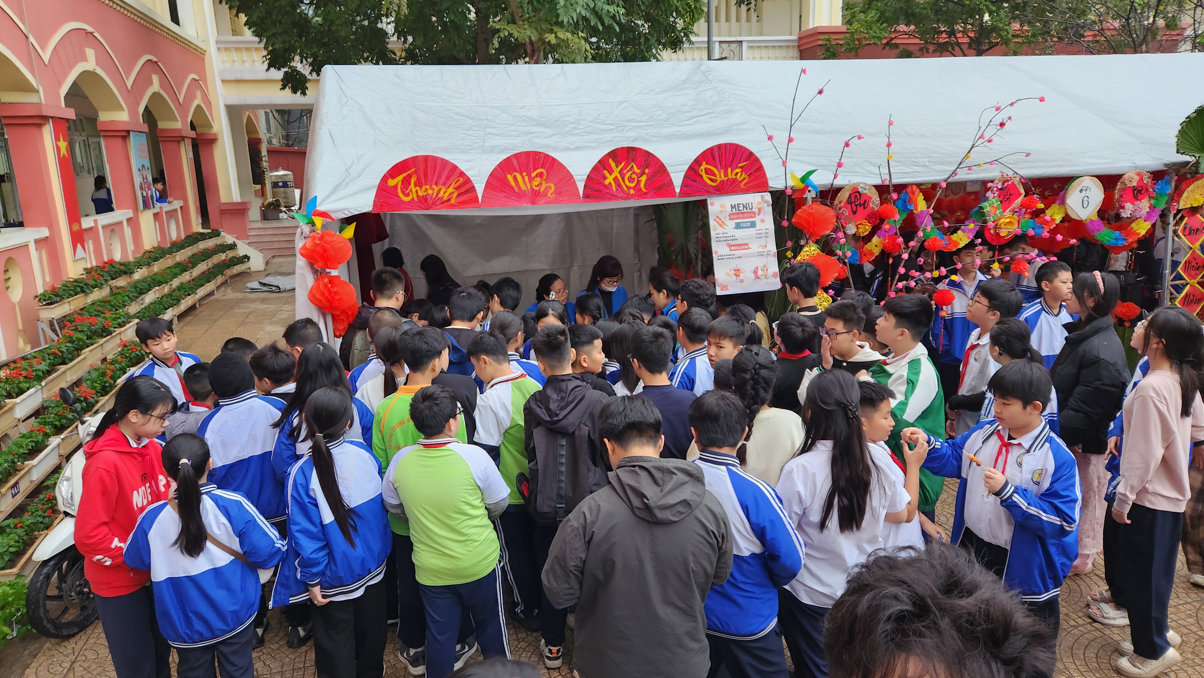 Cũng trong ngày hội xuân, các em học sinh còn được tham gia cùng các thầy cô giáo và các nghệ nhân trong hoạt động gói bánh chưng truyền thống, trang trí cành đào ngày tết.