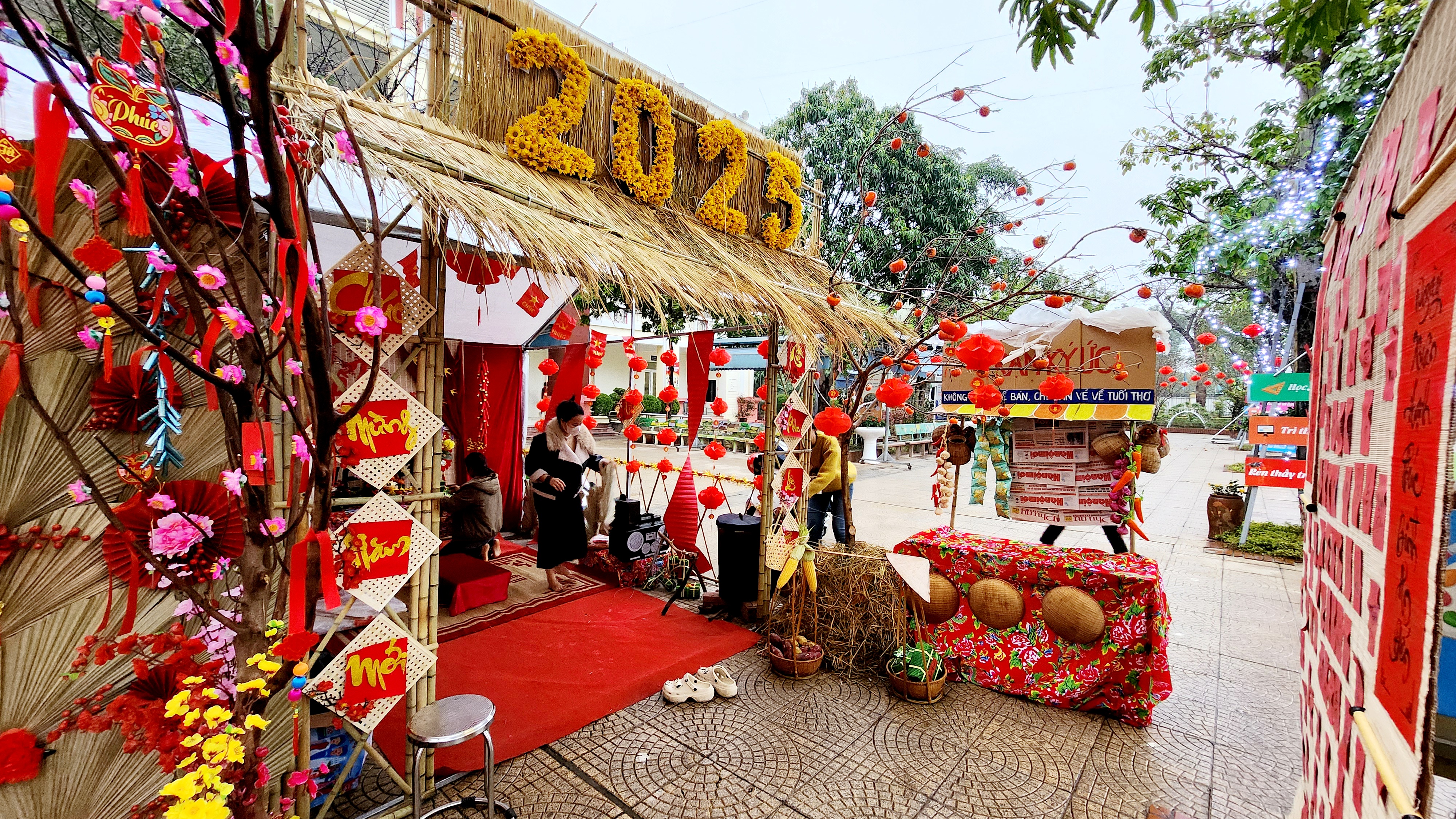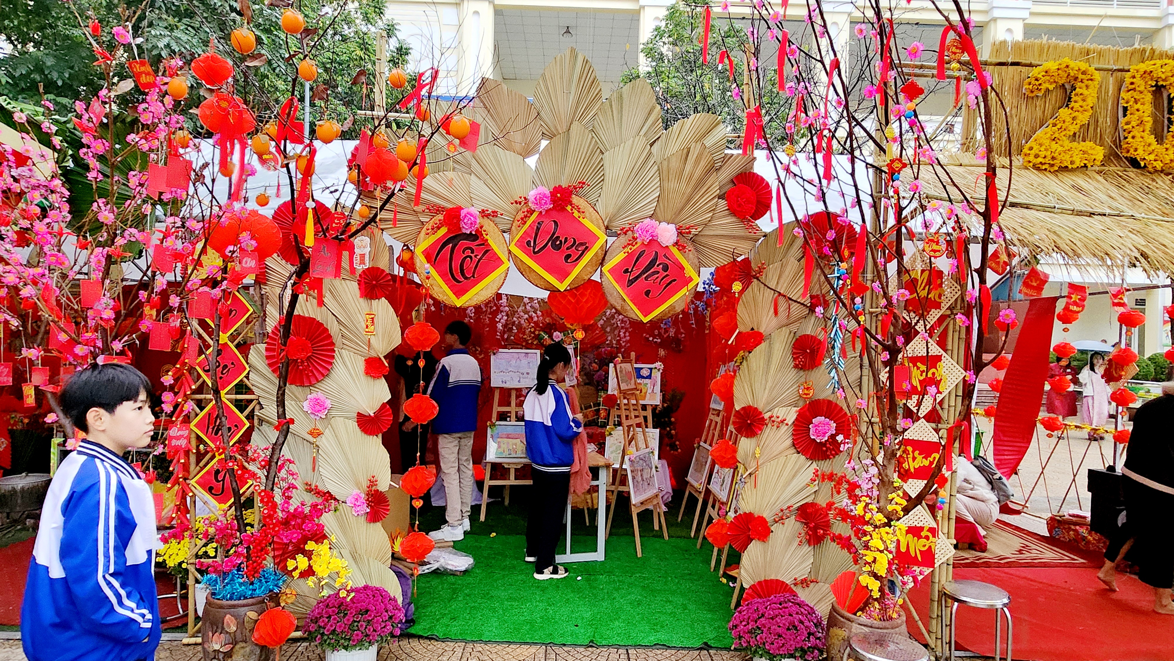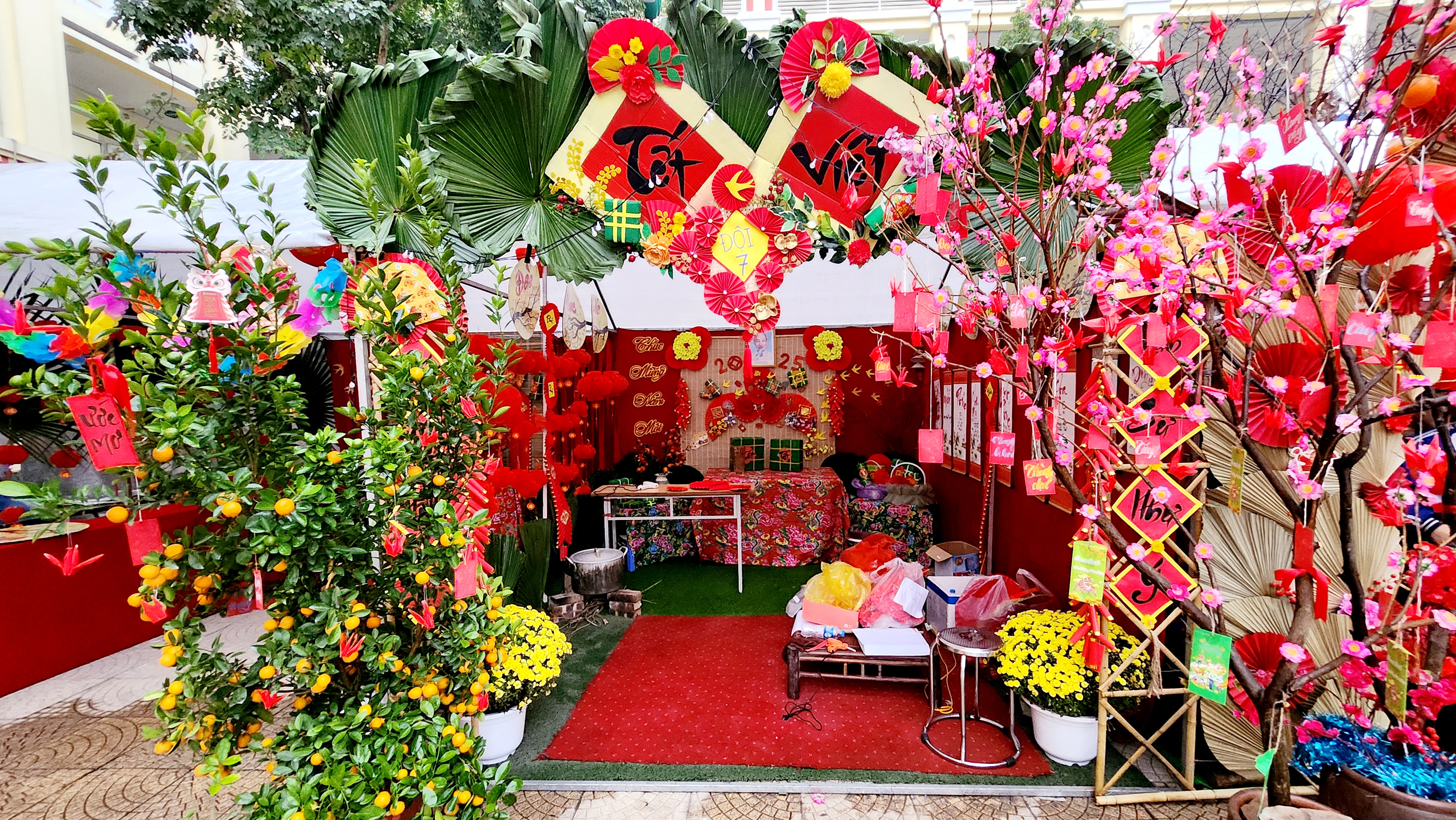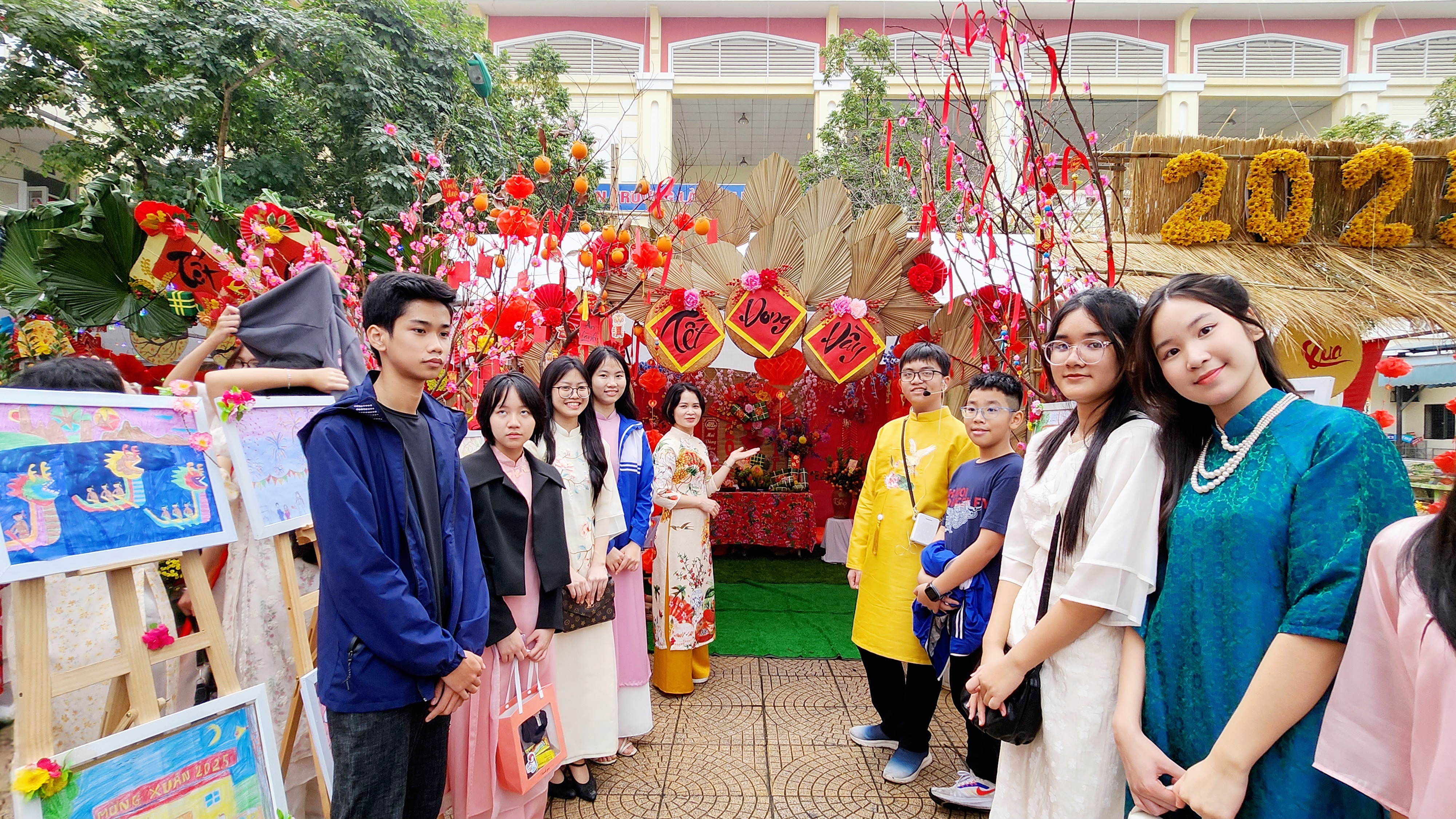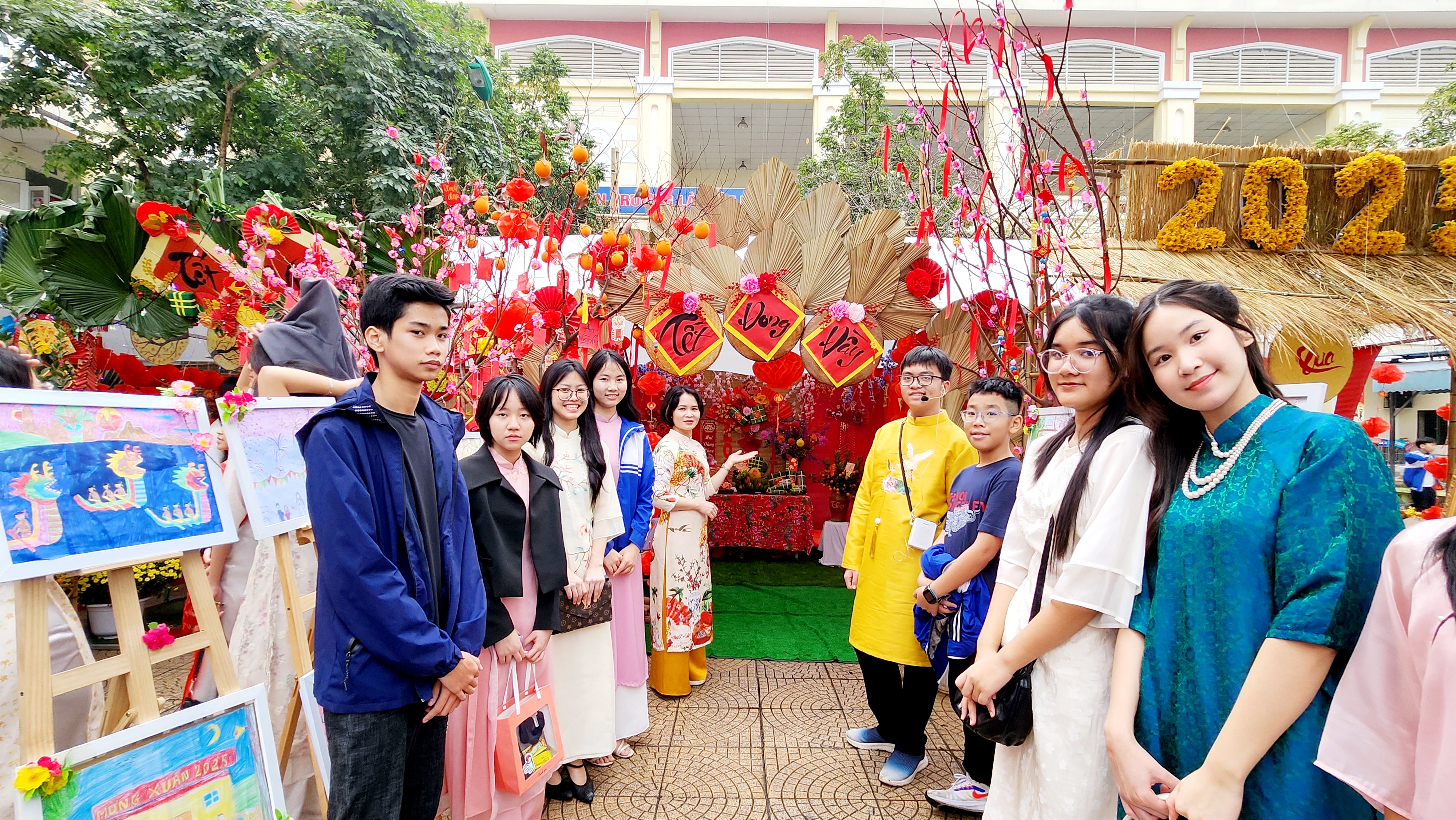Cũng trong ngày hội xuân, các em học sinh còn được tham gia cùng các thầy cô giáo và các nghệ nhân trong hoạt động gói bánh chưng truyền thống, trang trí cành đào ngày tết.
