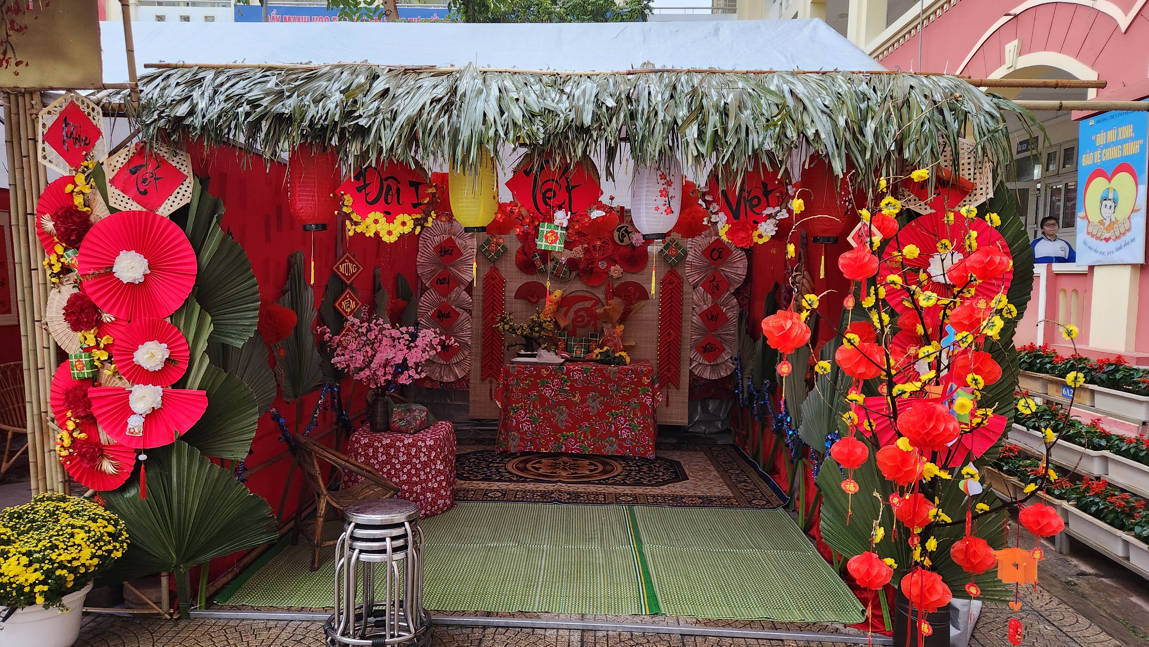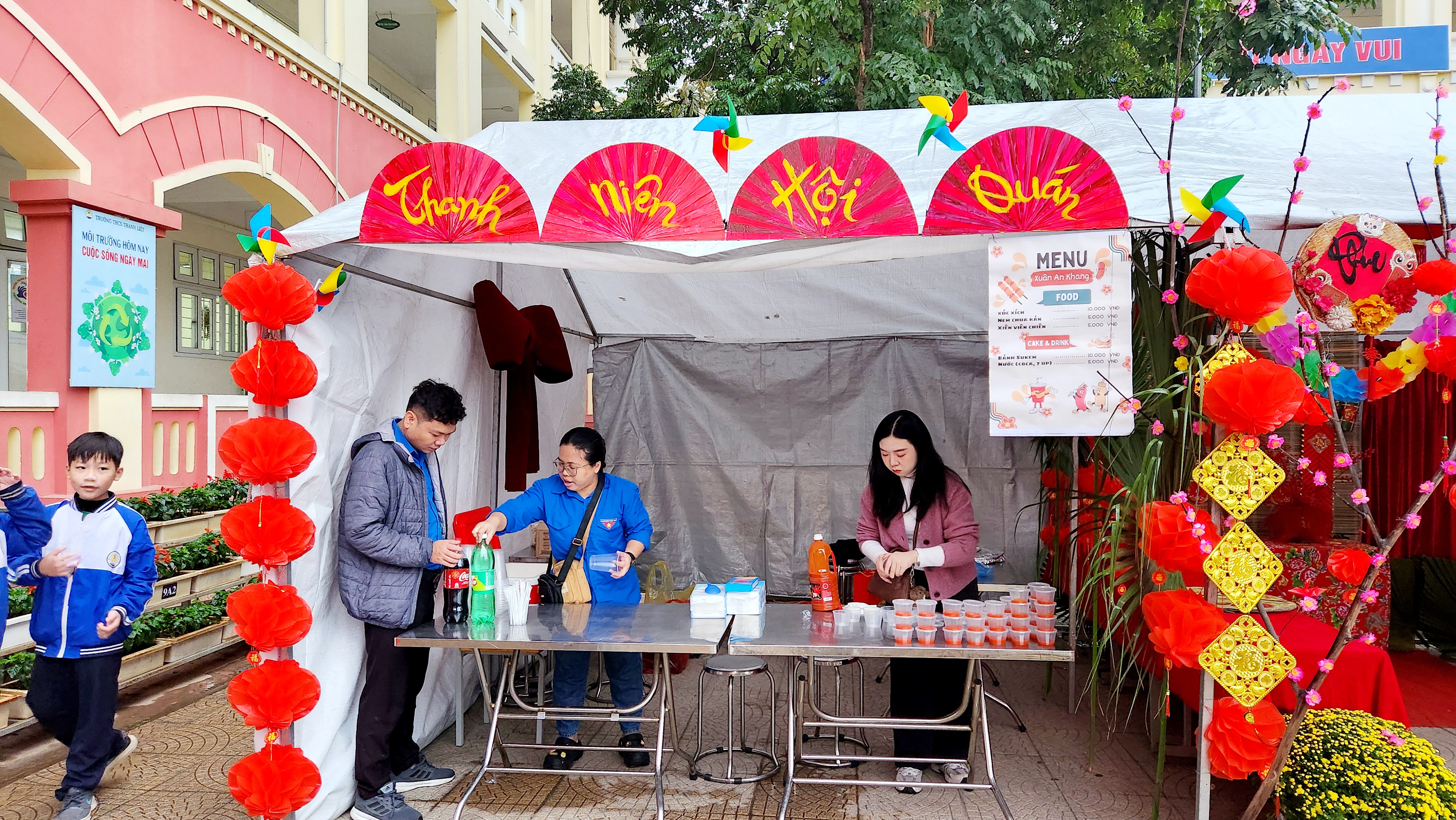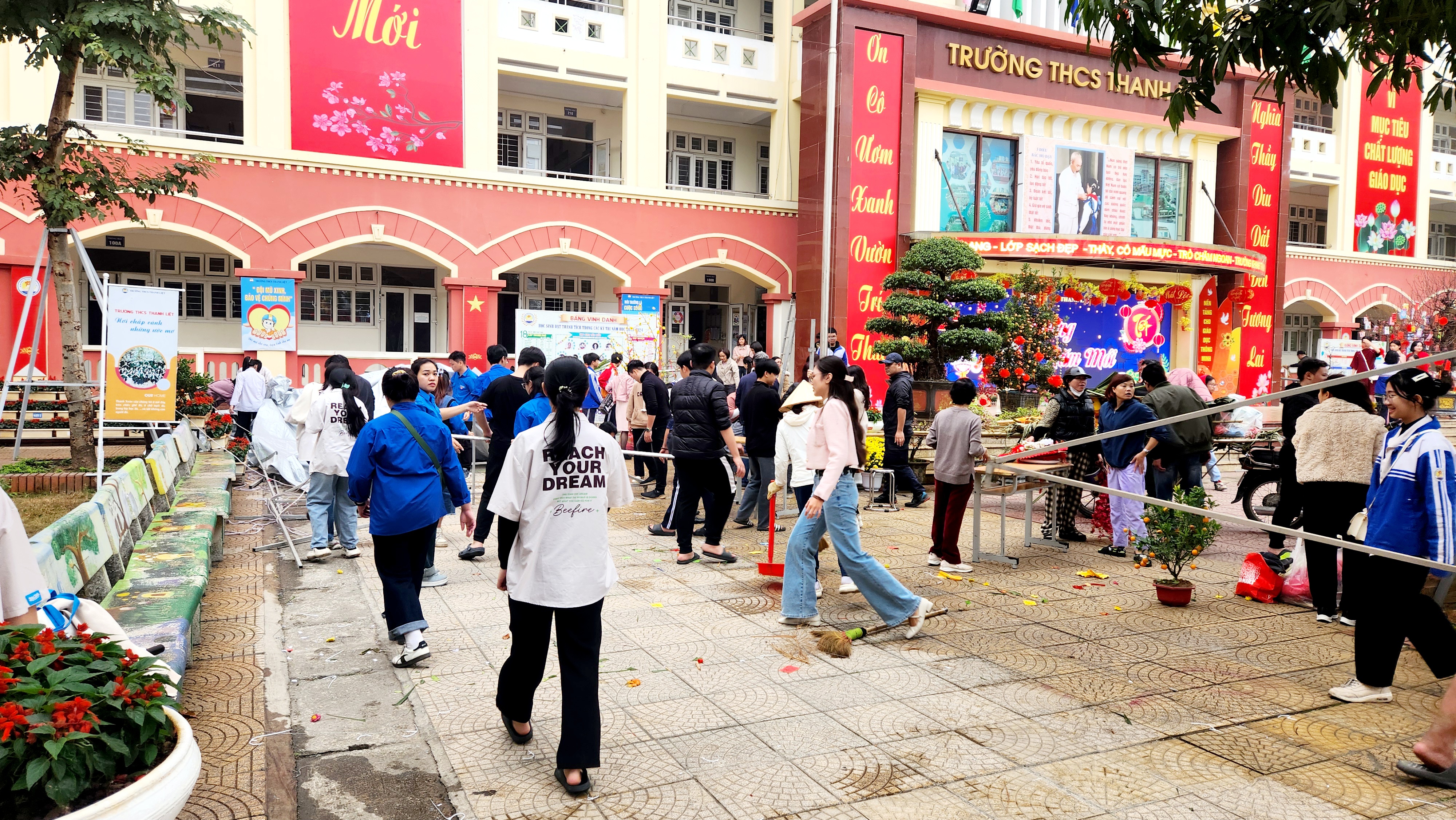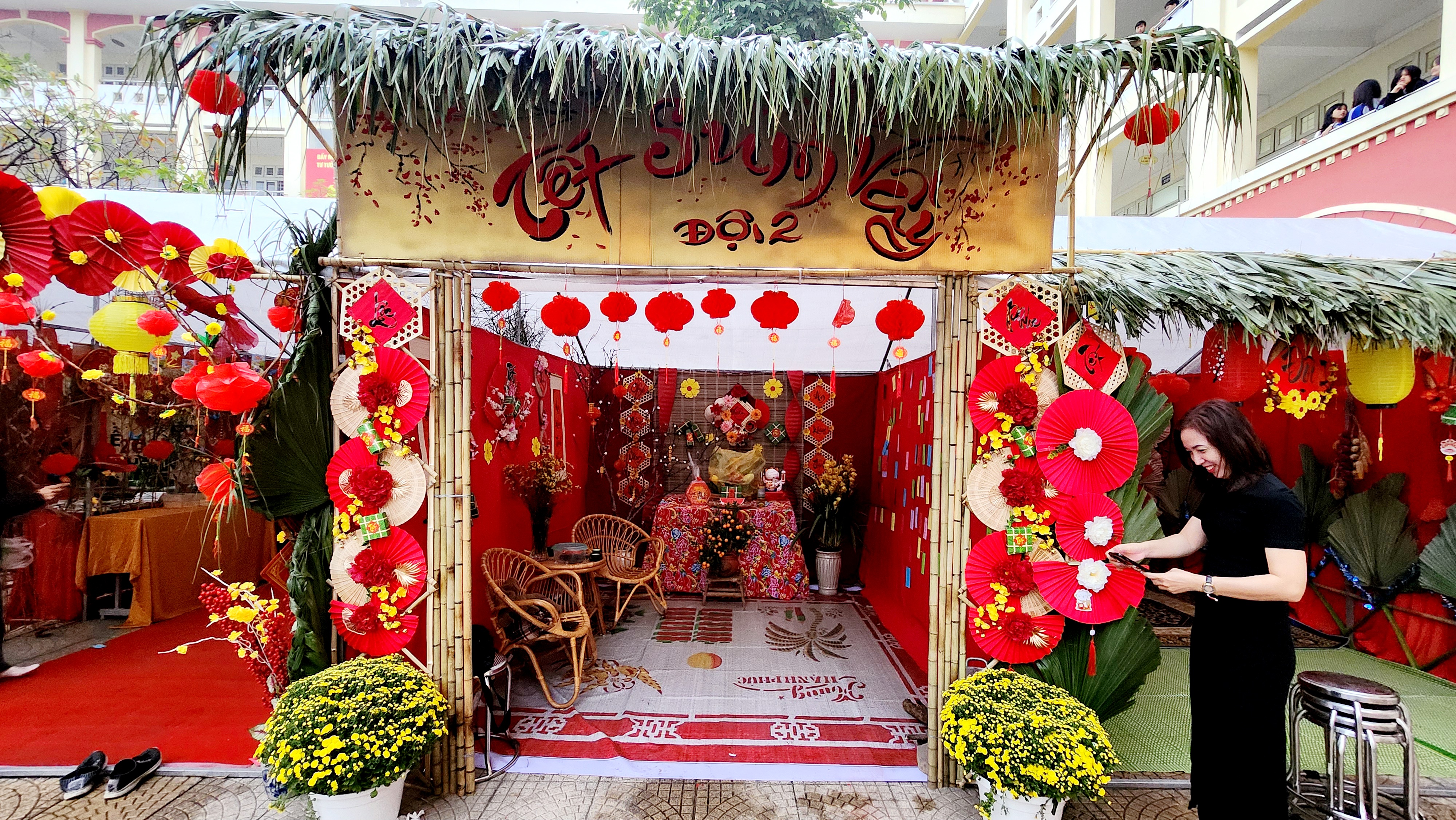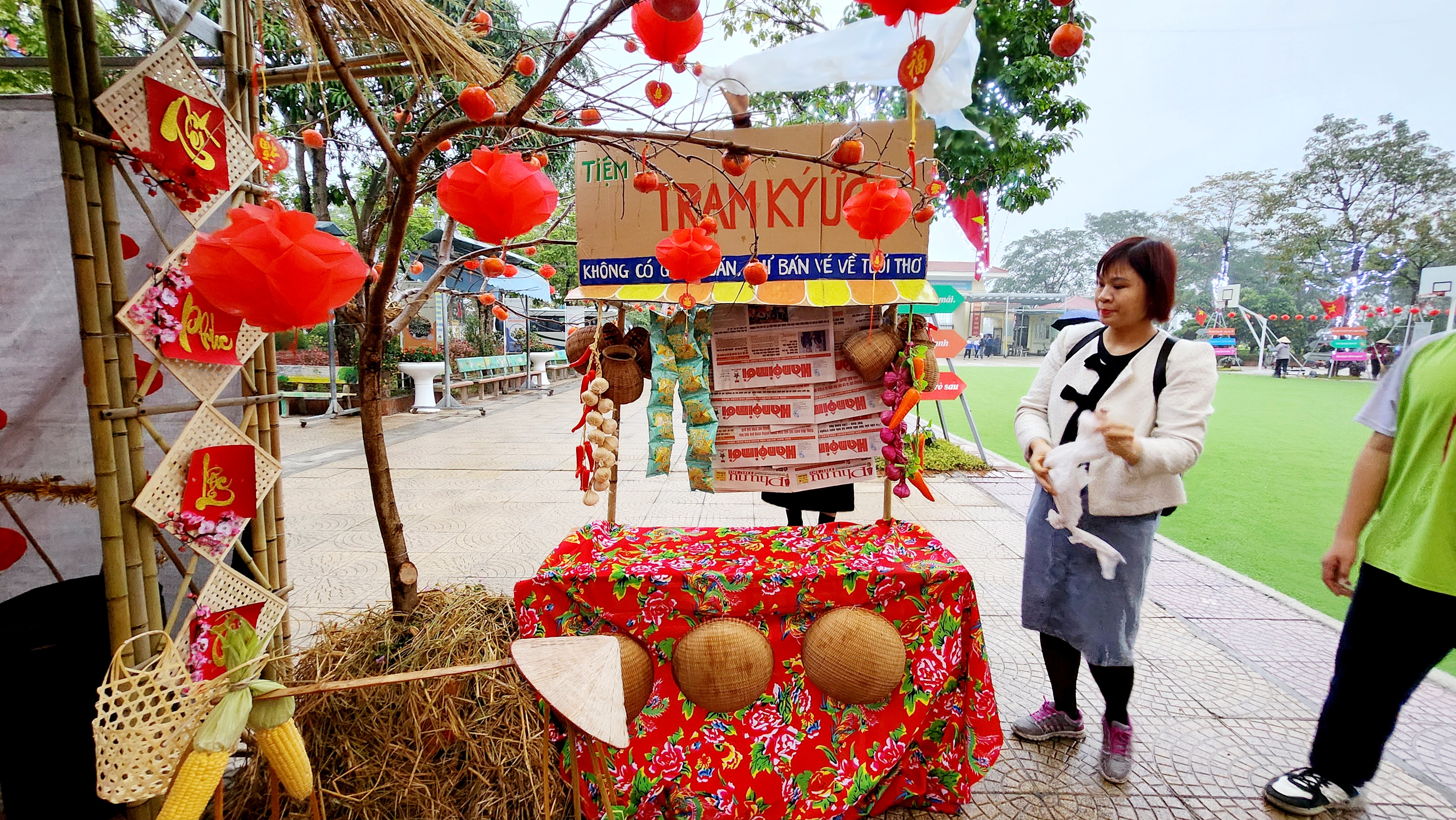 Cũng trong ngày hội xuân, các em học sinh còn được tham gia cùng các thầy cô giáo và các nghệ nhân trong hoạt động gói bánh chưng truyền thống, trang trí cành đào ngày tết.