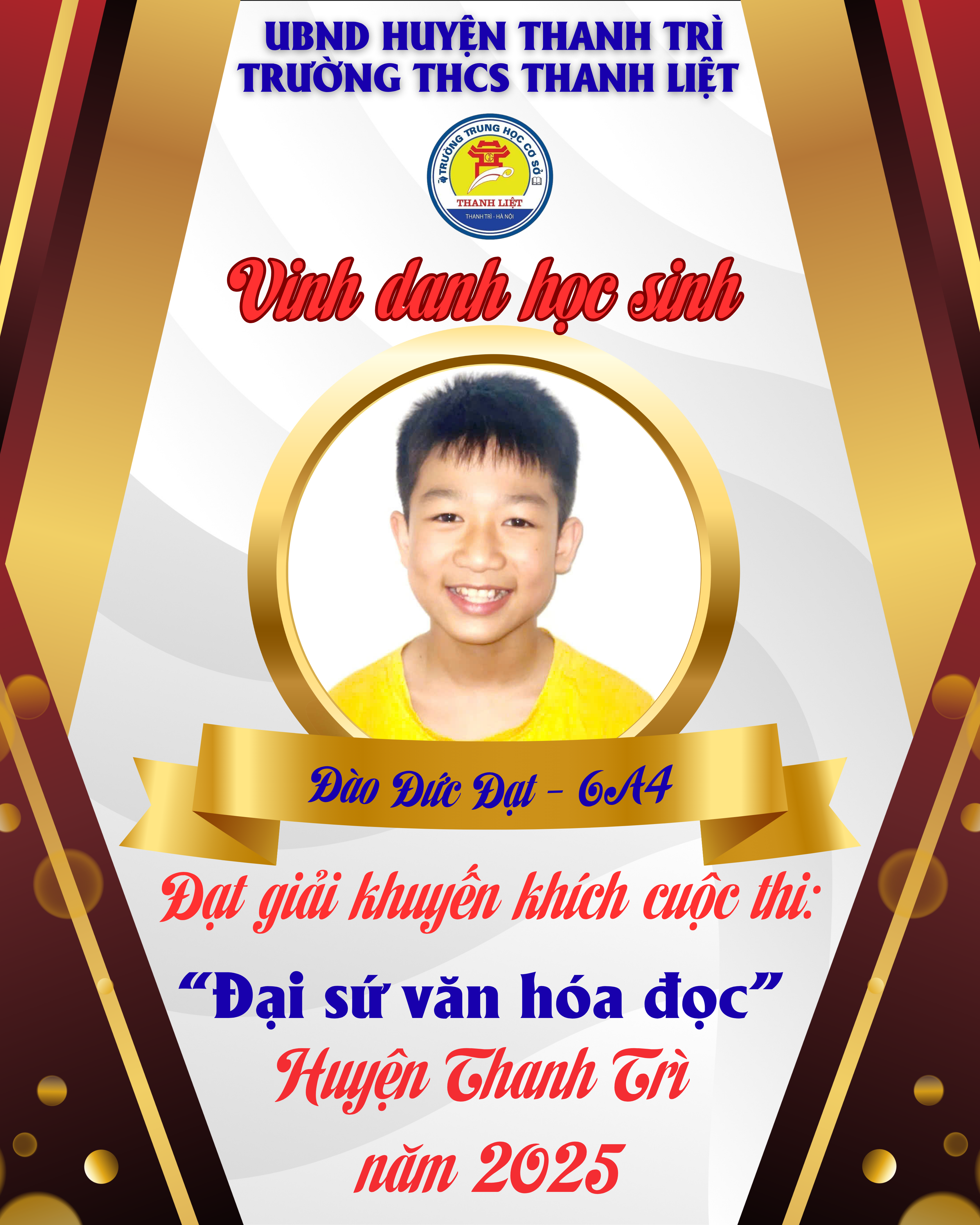 Em Đào Đức Đạt – học sinh lớp 6A4, với tinh thần học hỏi, sáng tạo và thông điệp truyền cảm hứng, đã đạt giải Khuyến Khích của cuộc thi.