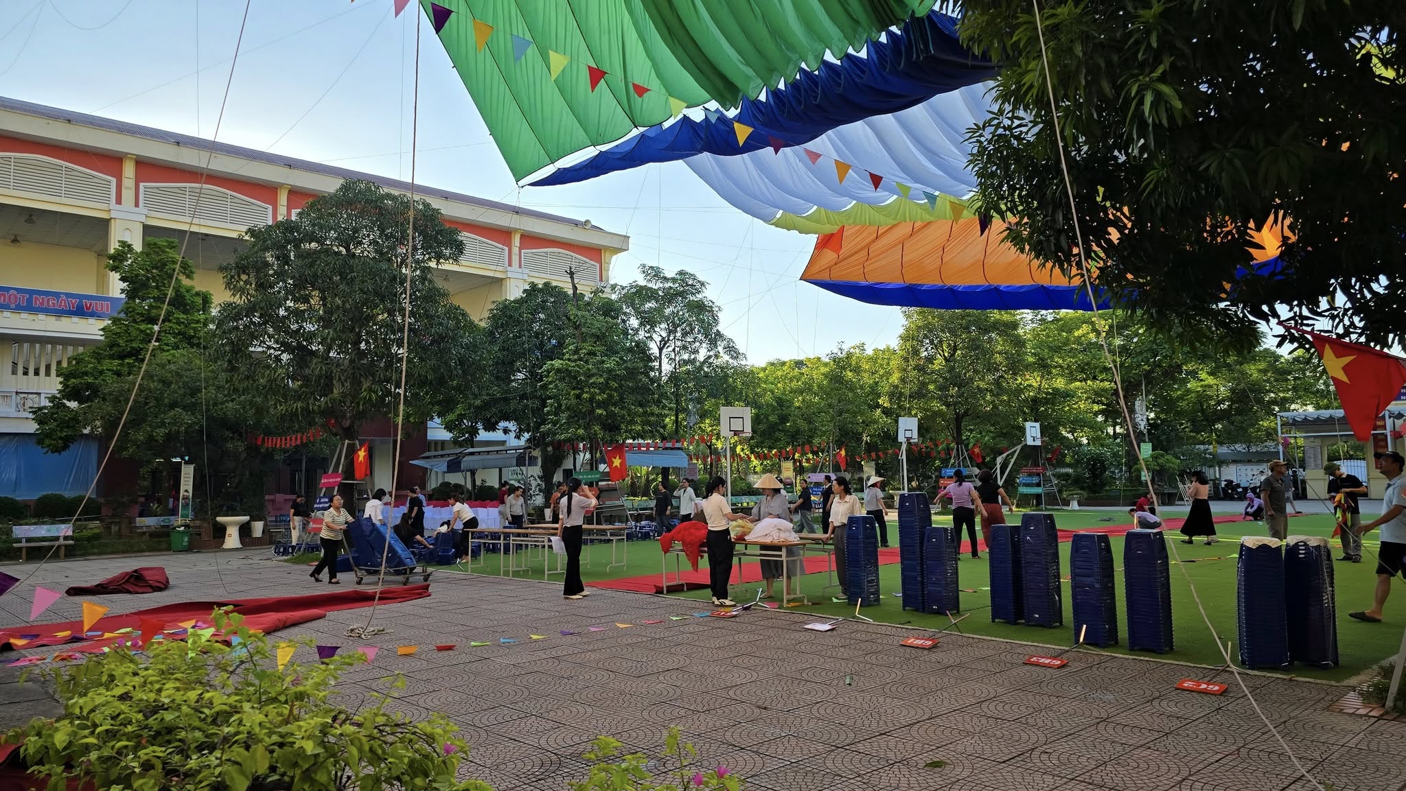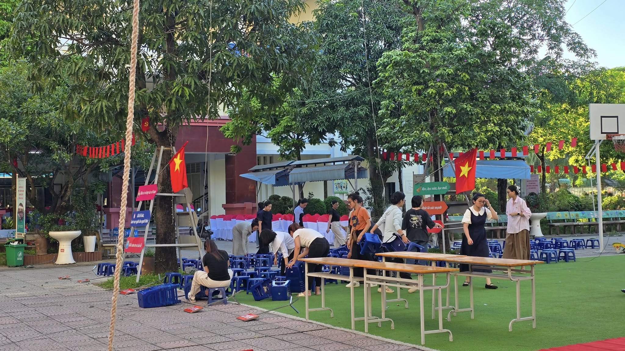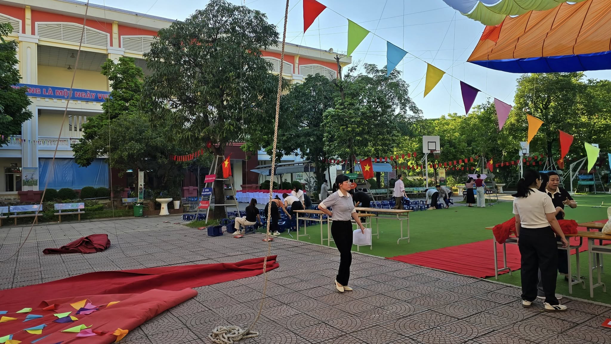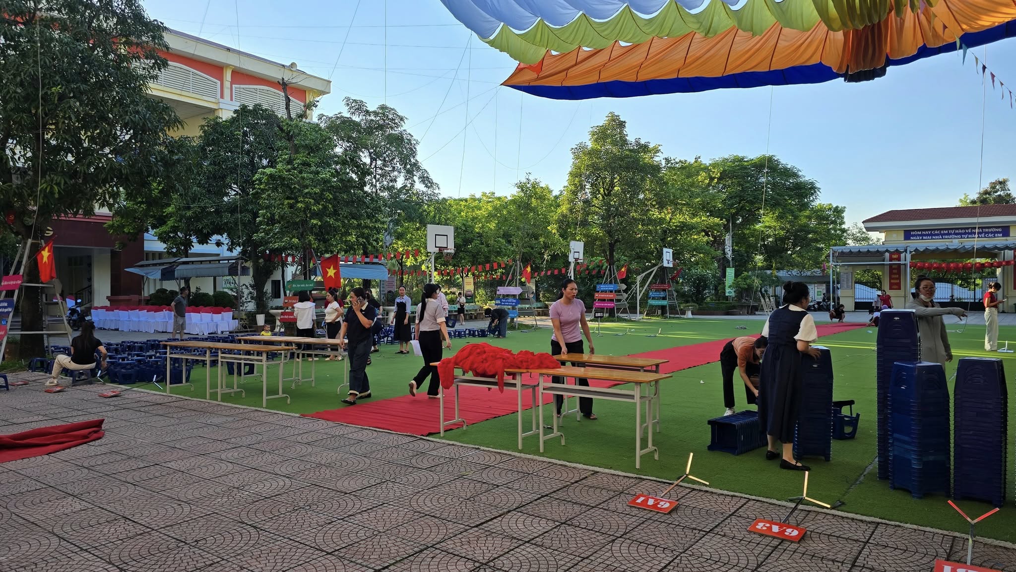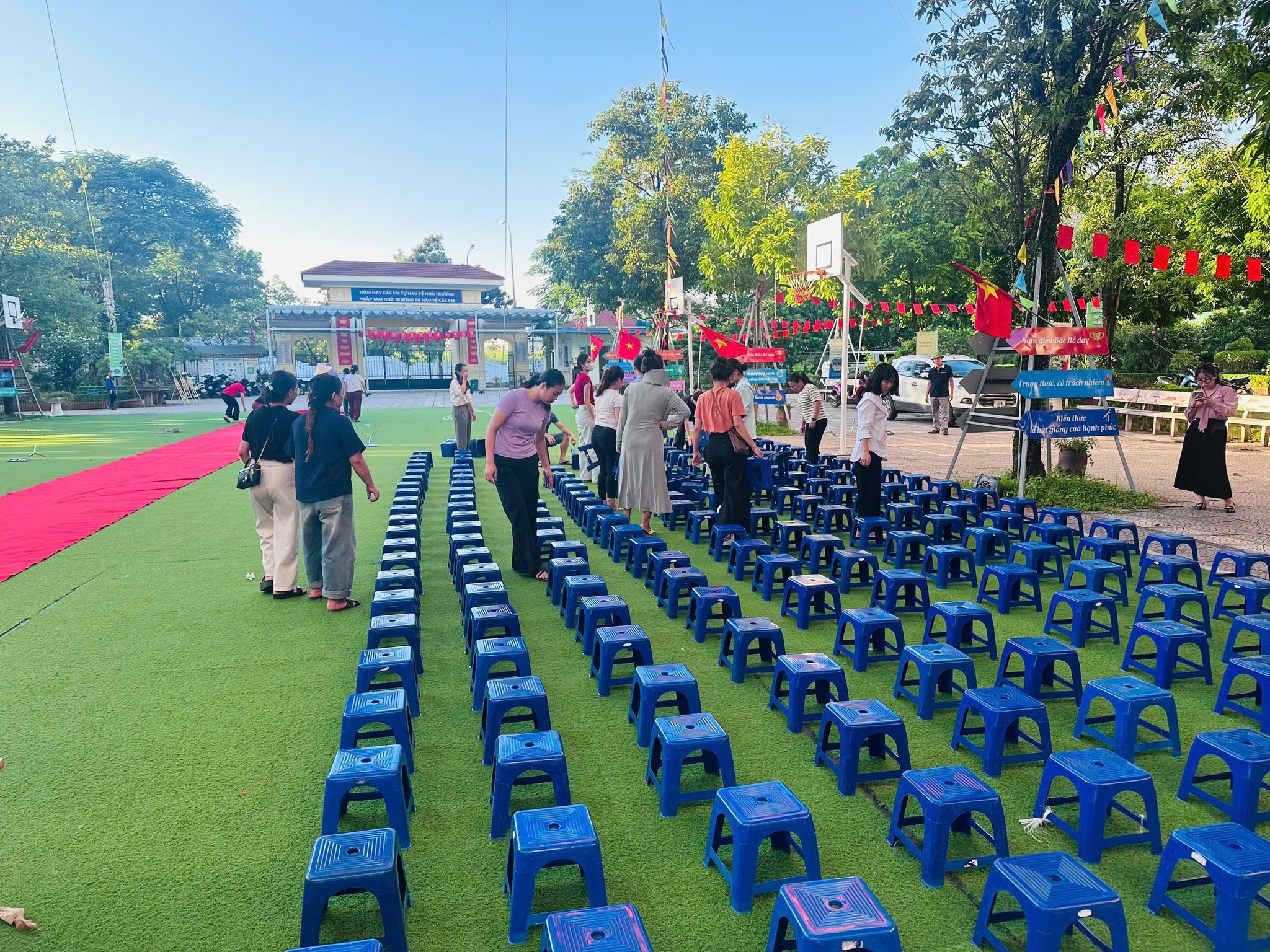 Khuôn viên trường được tô điểm rực rỡ cờ hoa, từng hàng ghế ngay ngắn chờ đón những gương mặt học sinh rạng rỡ trong ngày hội lớn.