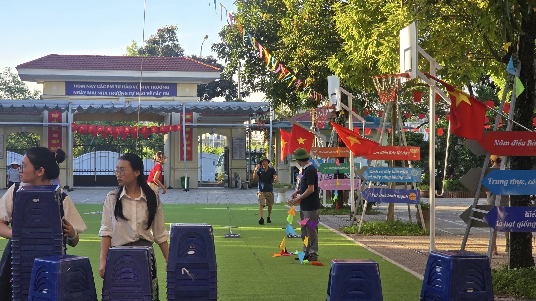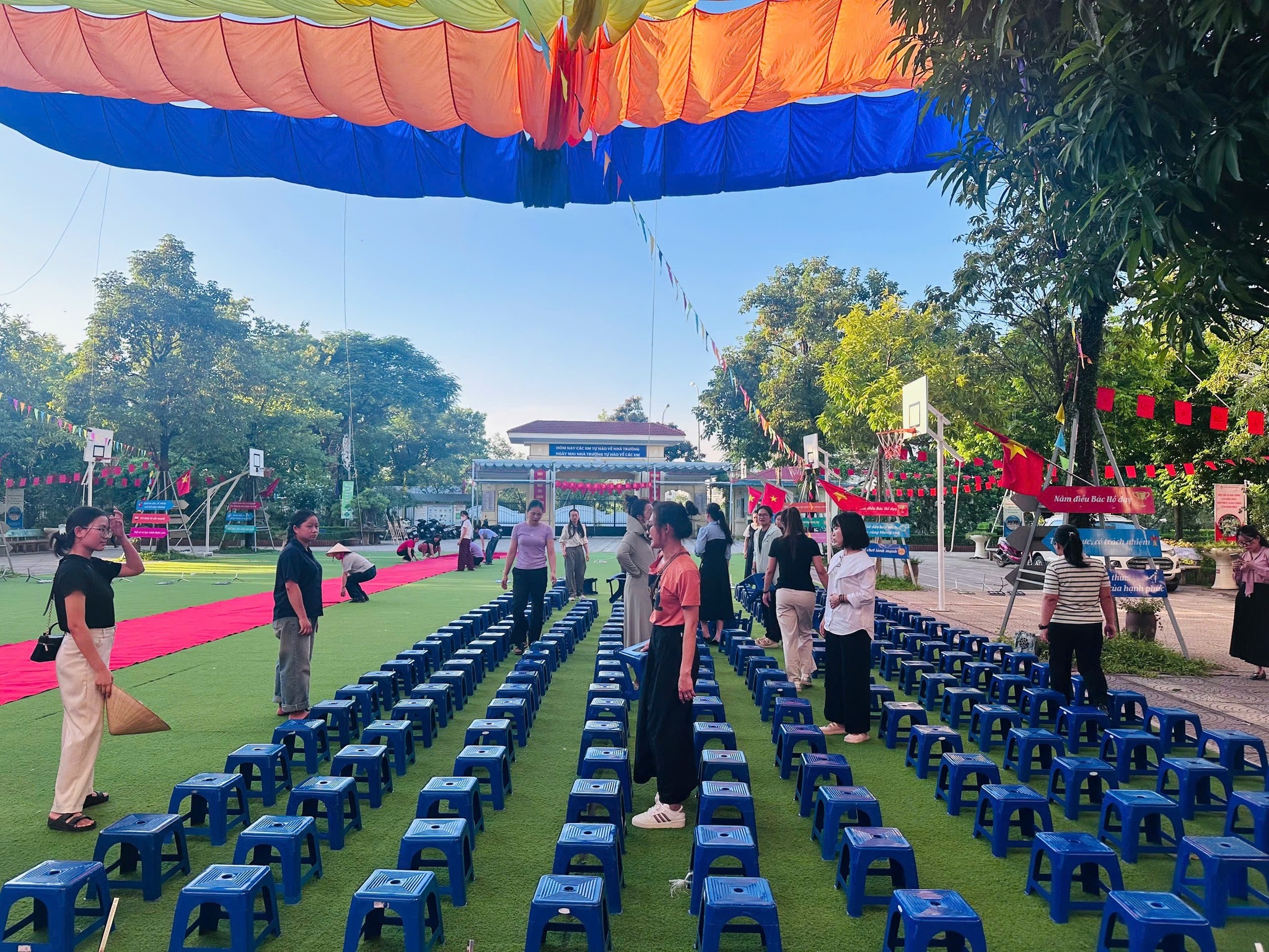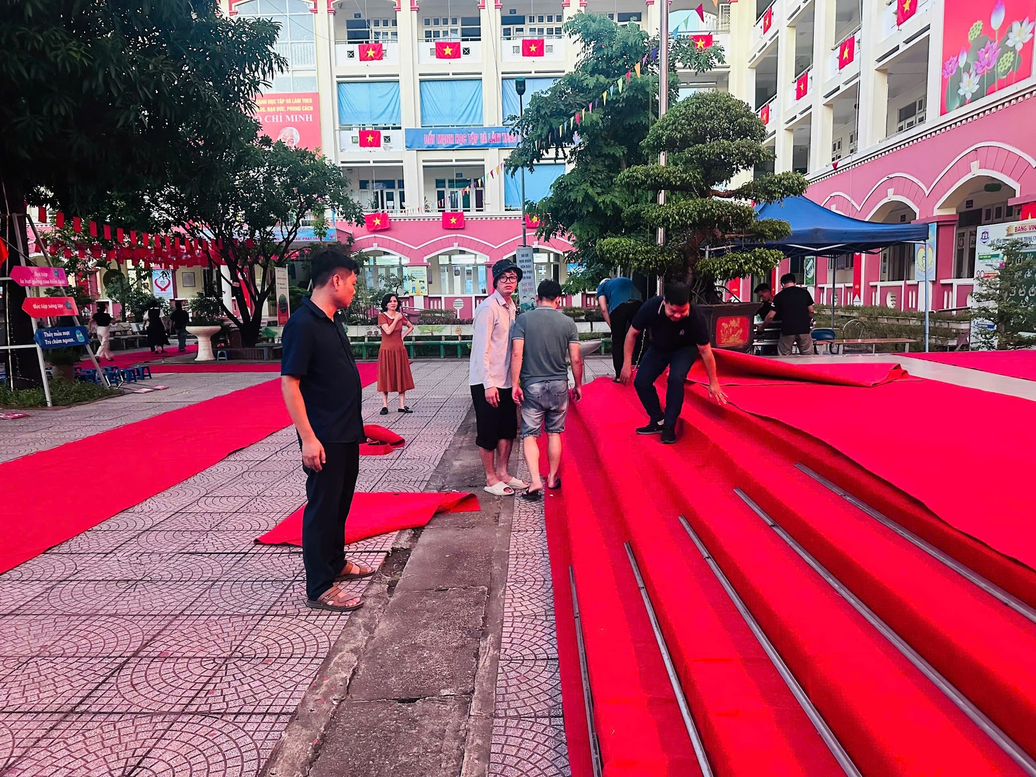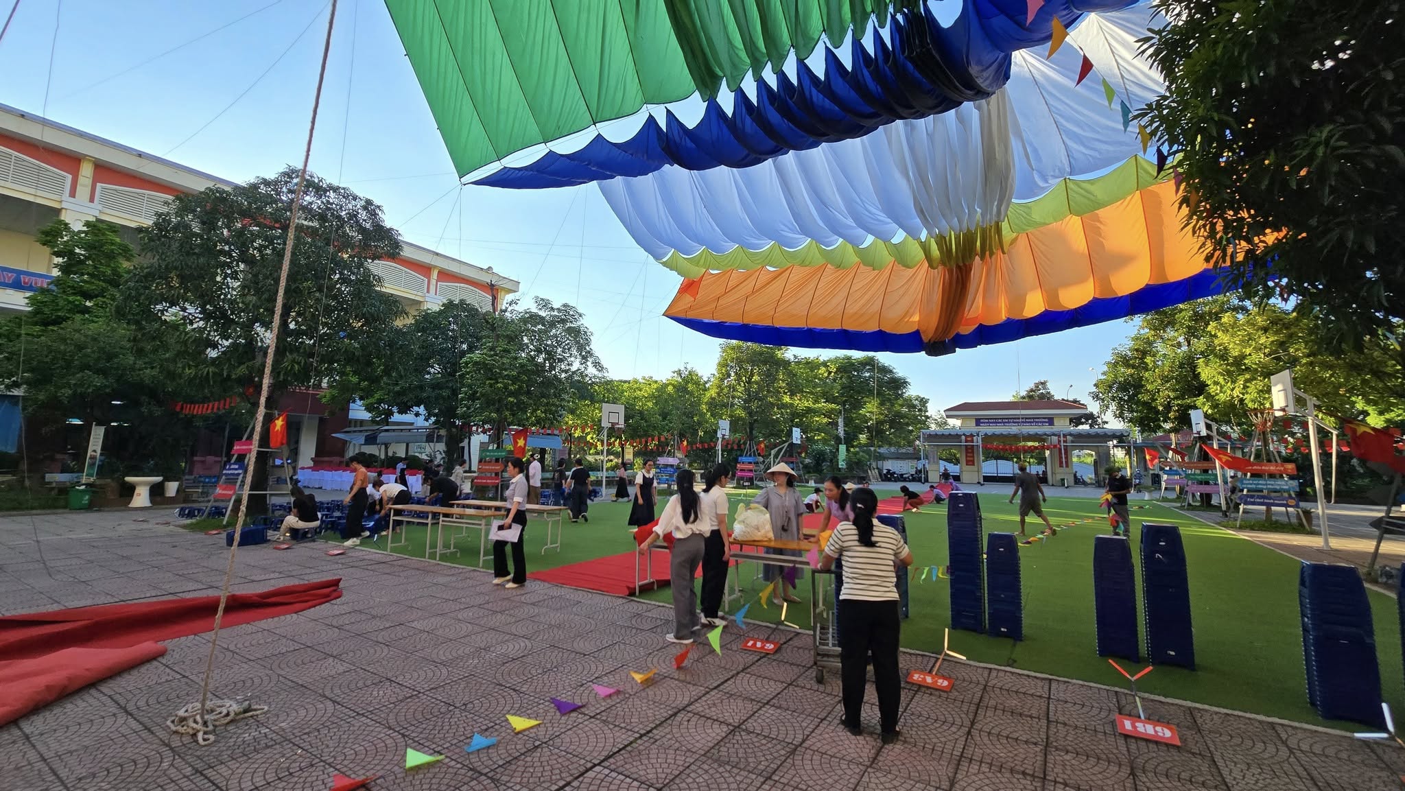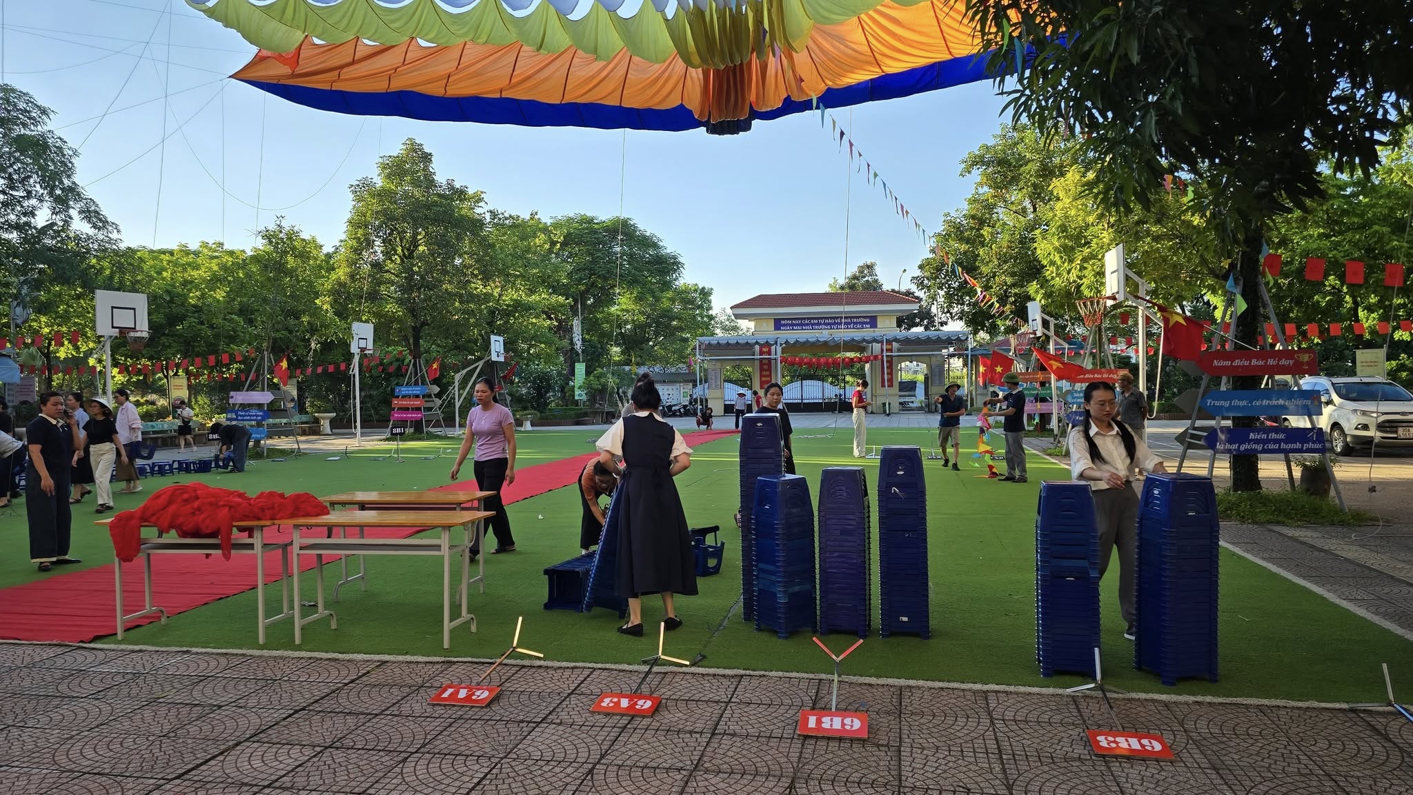Khuôn viên trường được tô điểm rực rỡ cờ hoa, từng hàng ghế ngay ngắn chờ đón những gương mặt học sinh rạng rỡ trong ngày hội lớn.