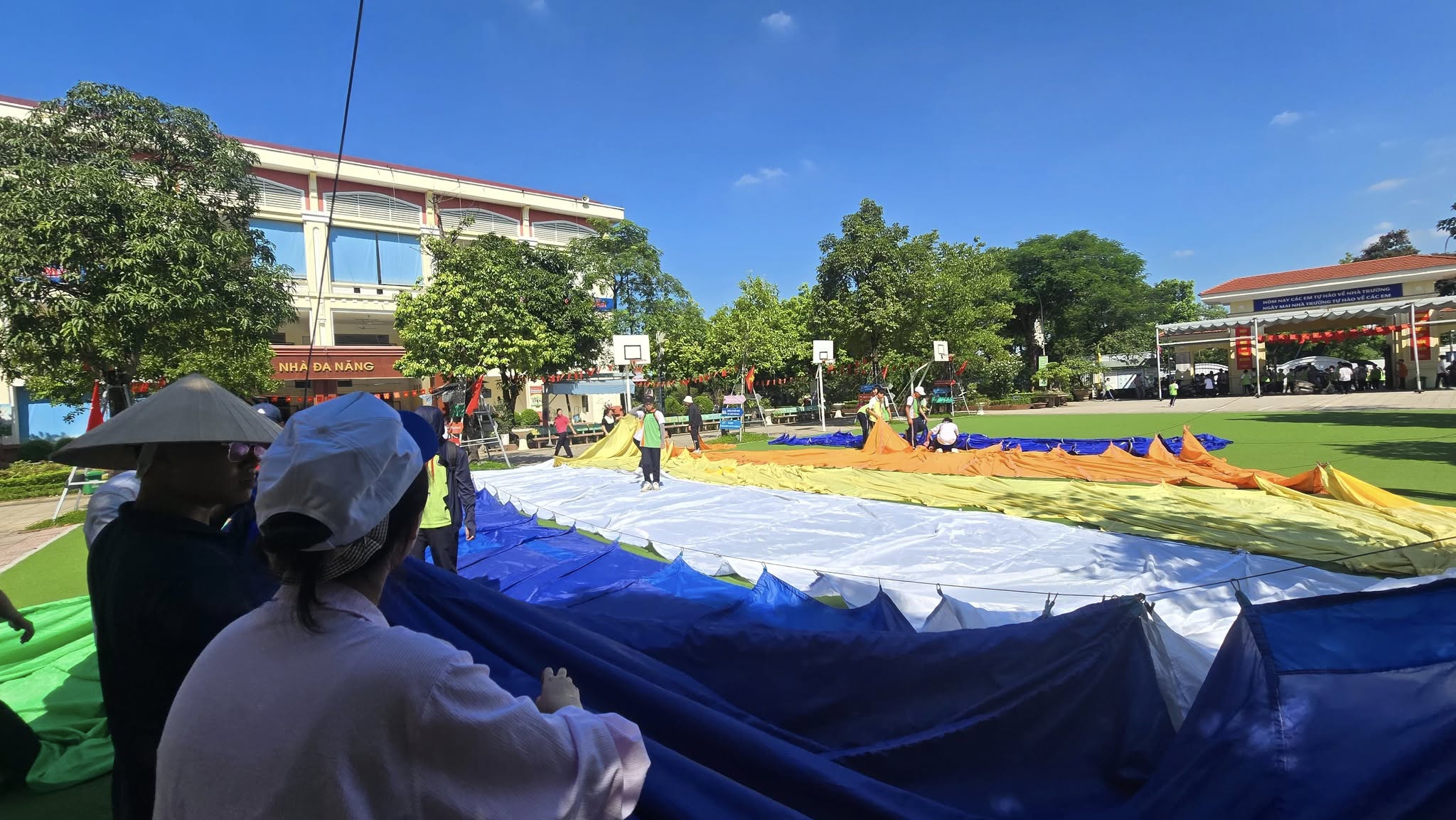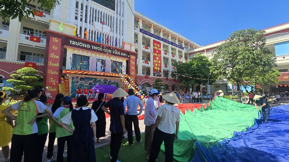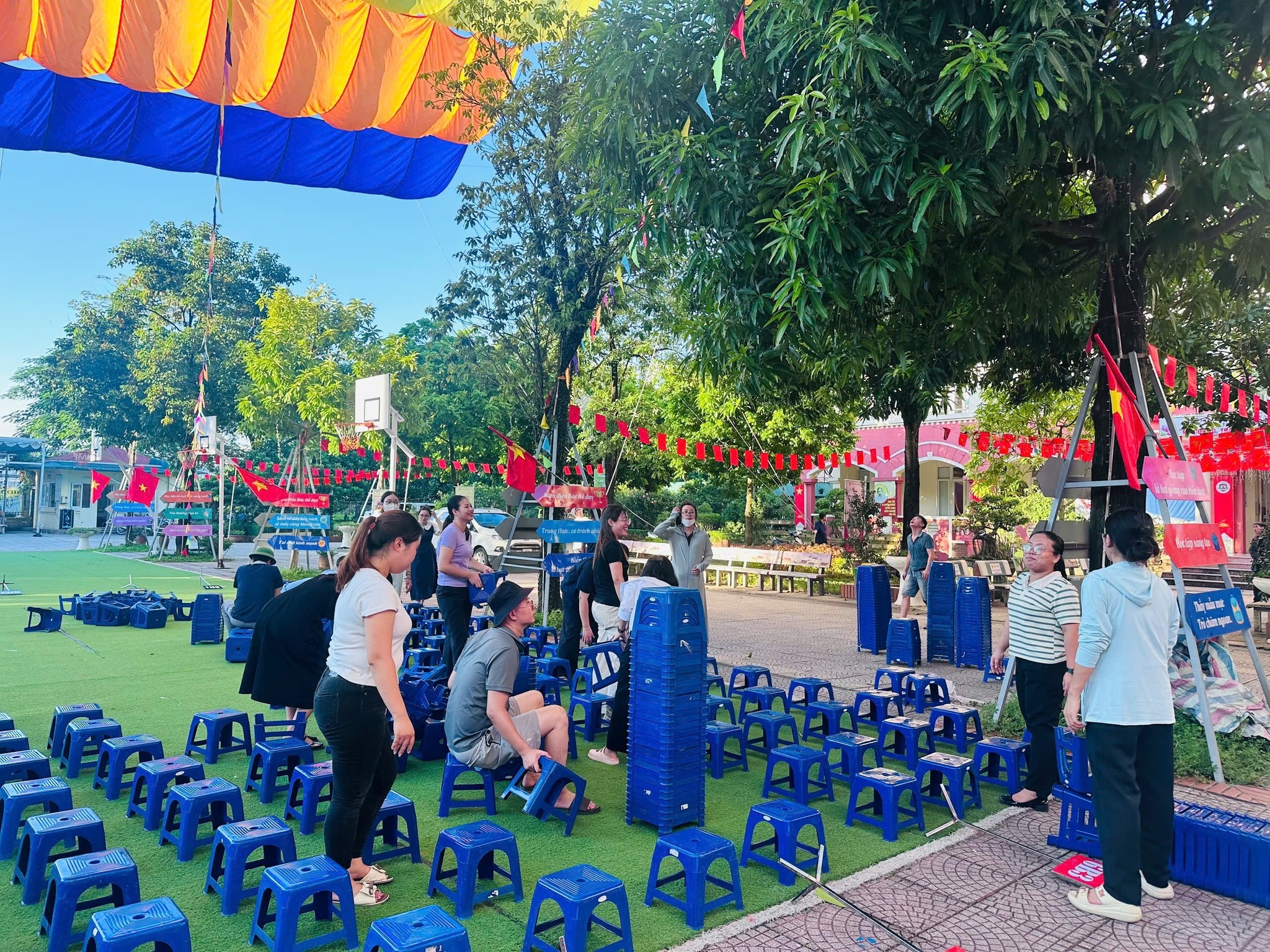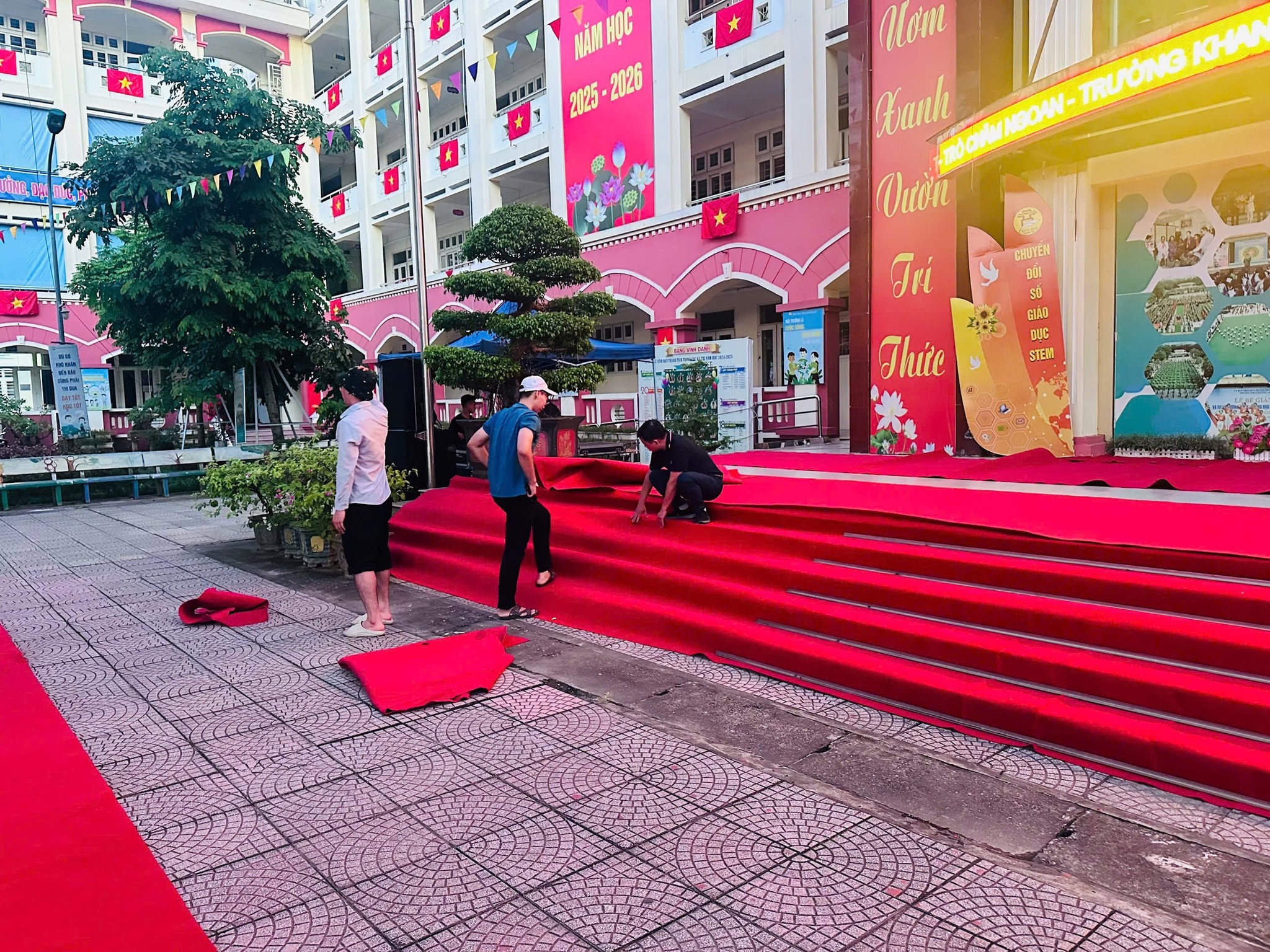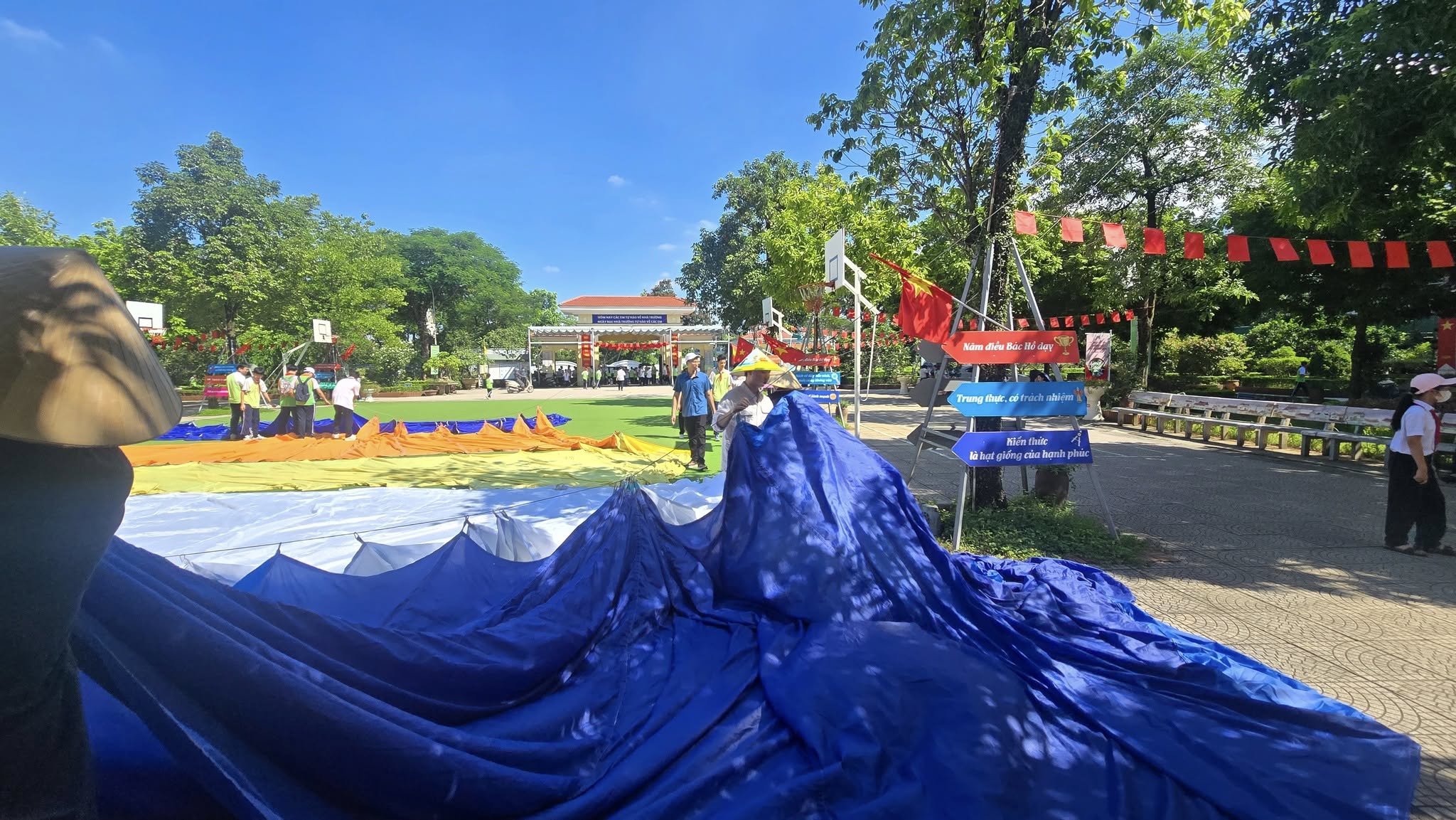 Khuôn viên trường được tô điểm rực rỡ cờ hoa, từng hàng ghế ngay ngắn chờ đón những gương mặt học sinh rạng rỡ trong ngày hội lớn.
