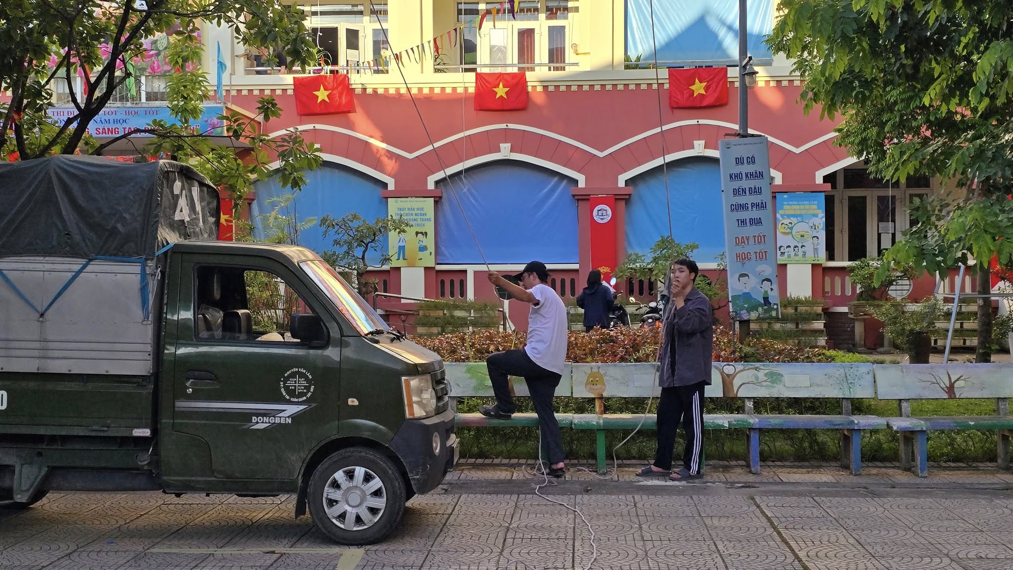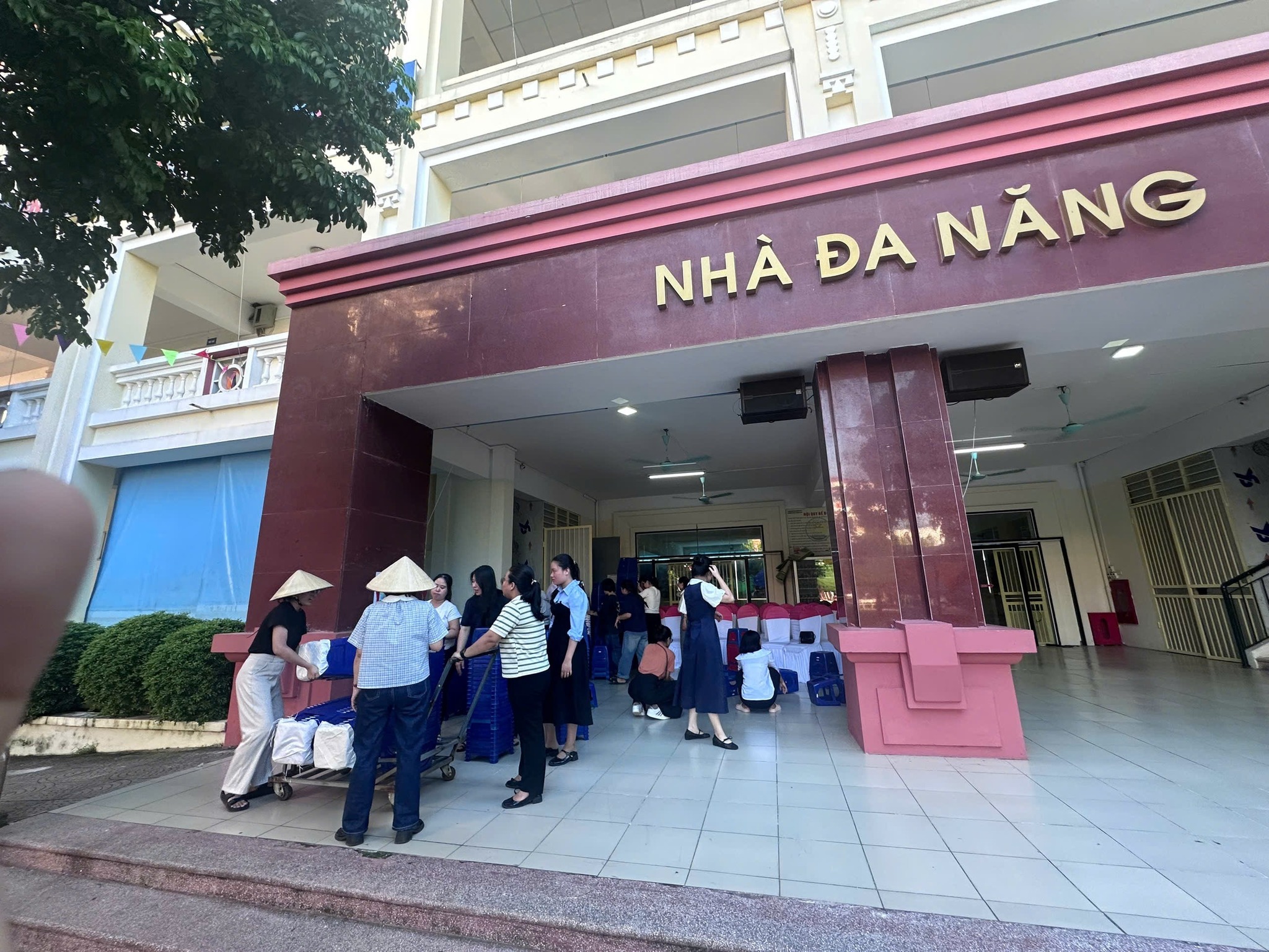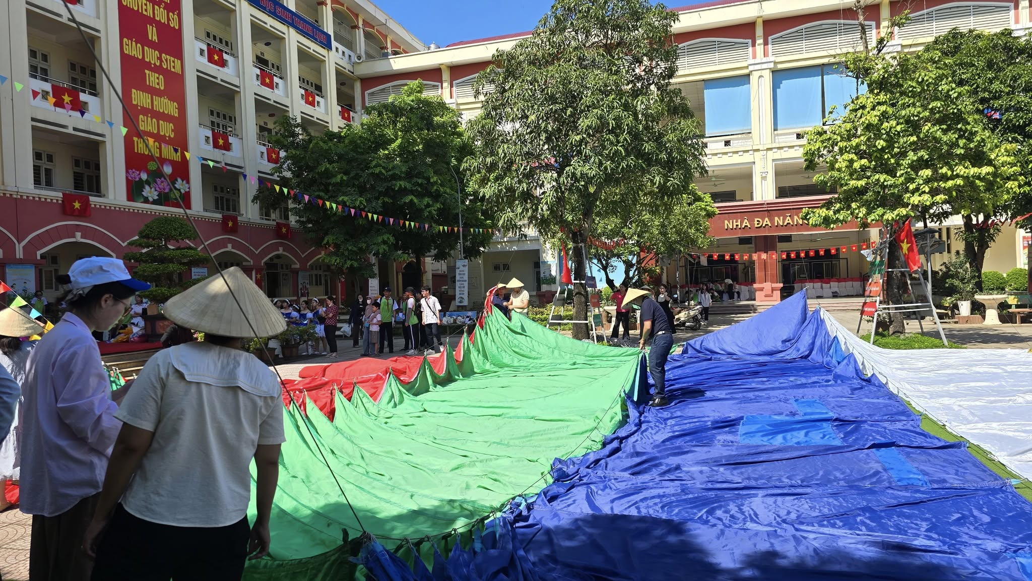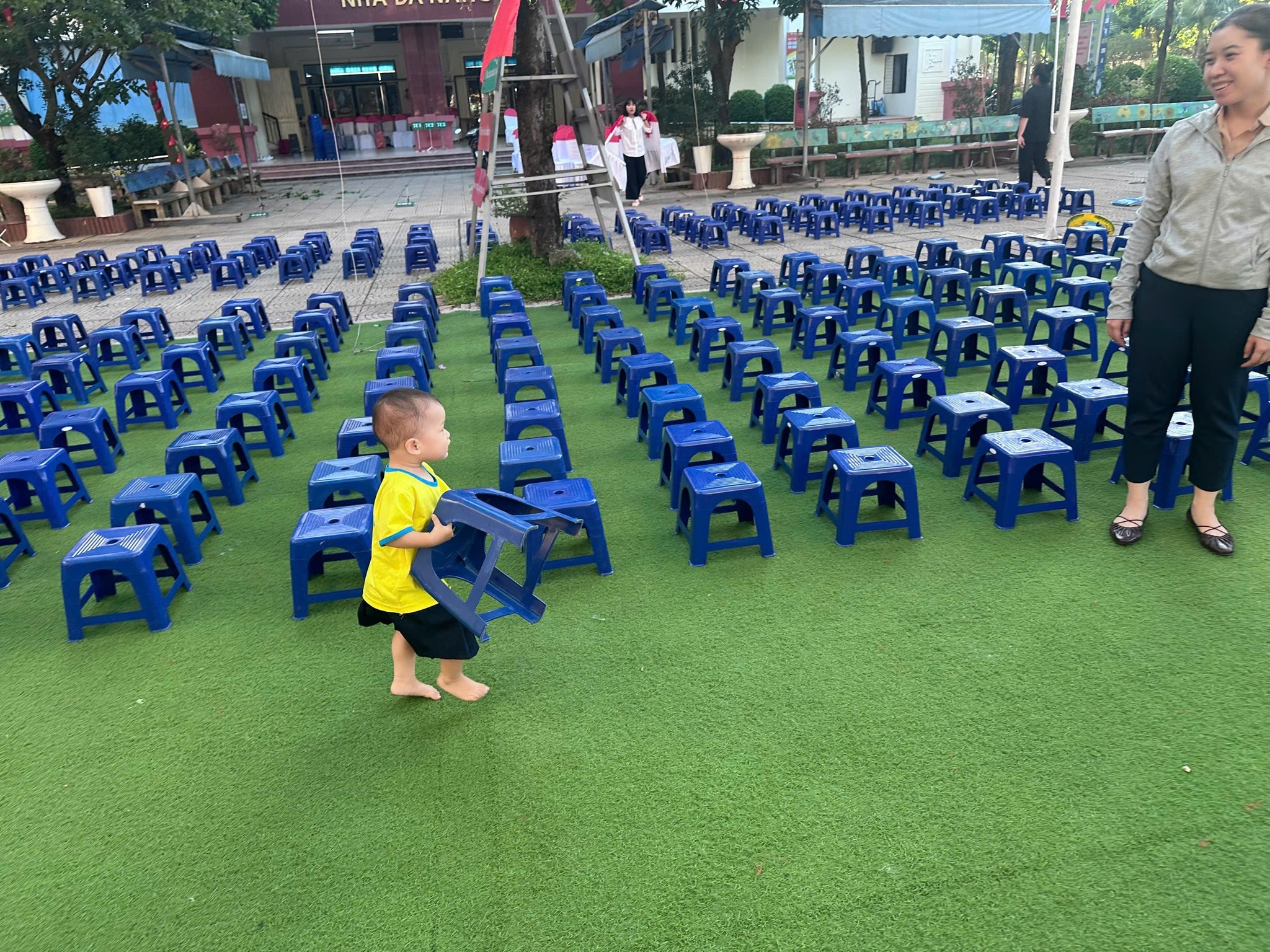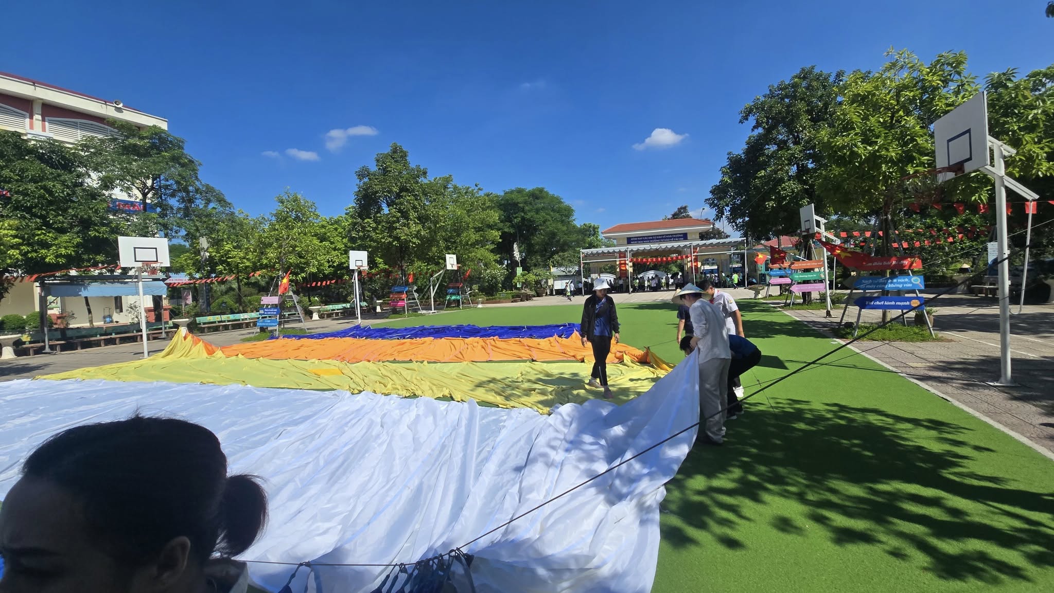 Khuôn viên trường được tô điểm rực rỡ cờ hoa, từng hàng ghế ngay ngắn chờ đón những gương mặt học sinh rạng rỡ trong ngày hội lớn.
