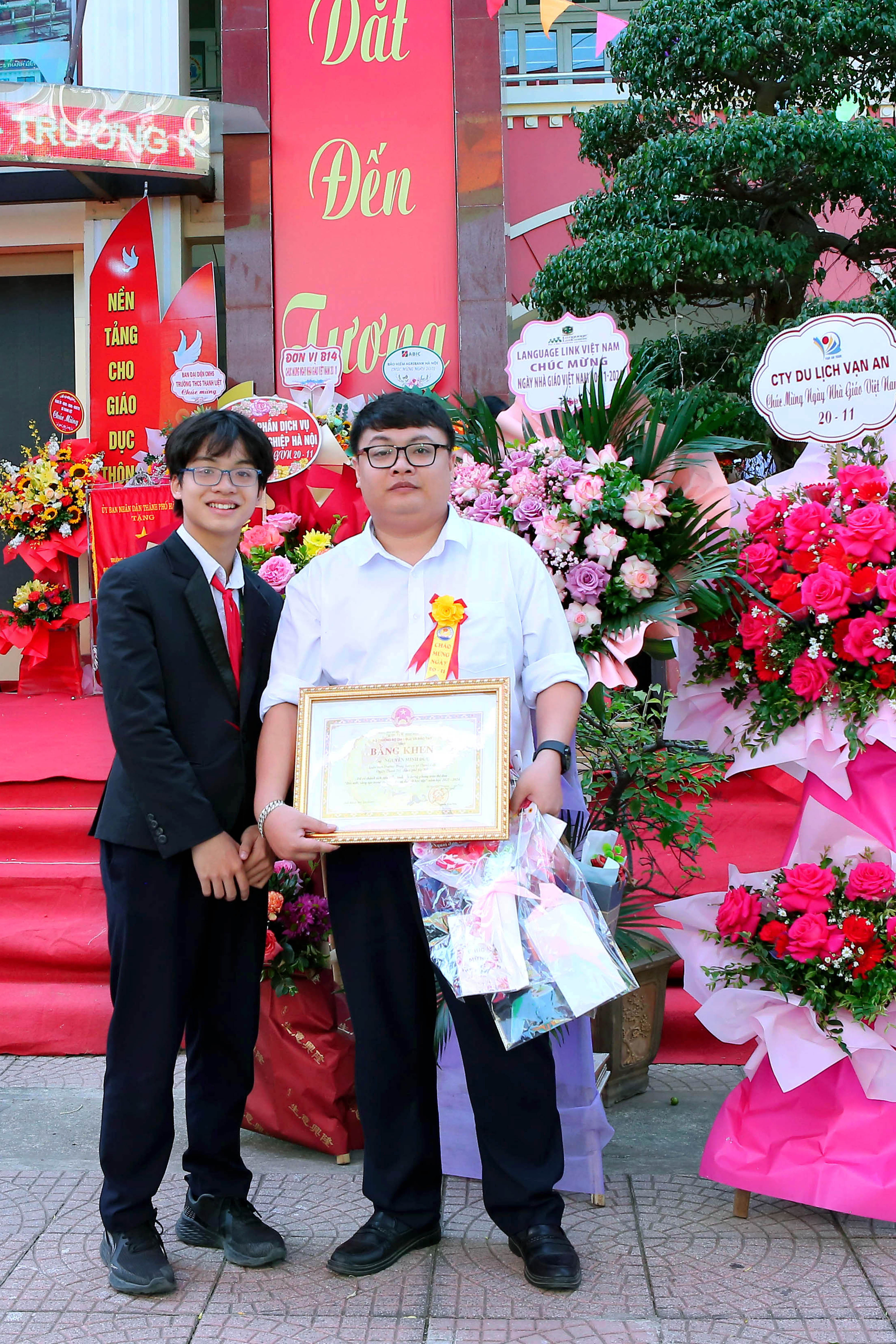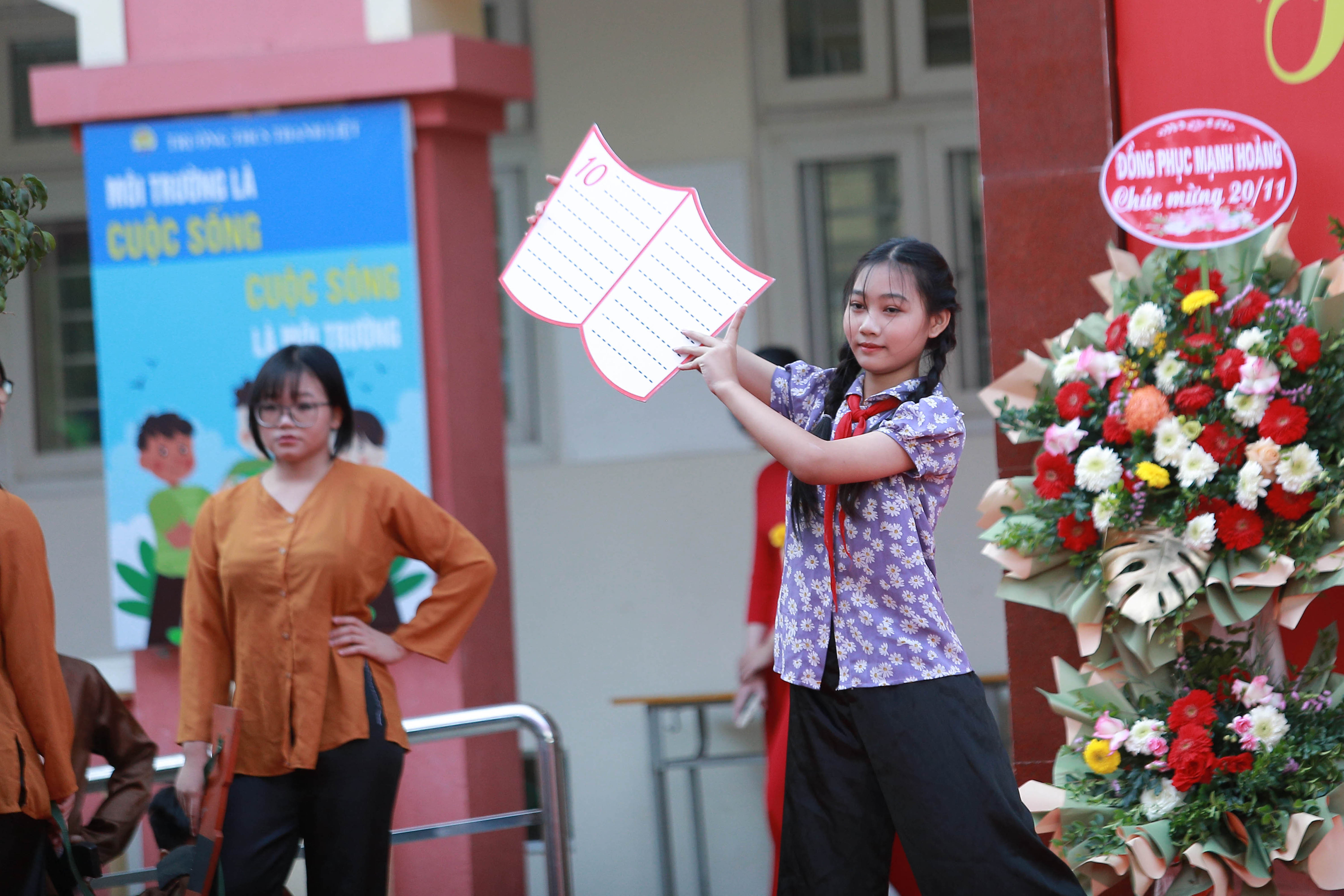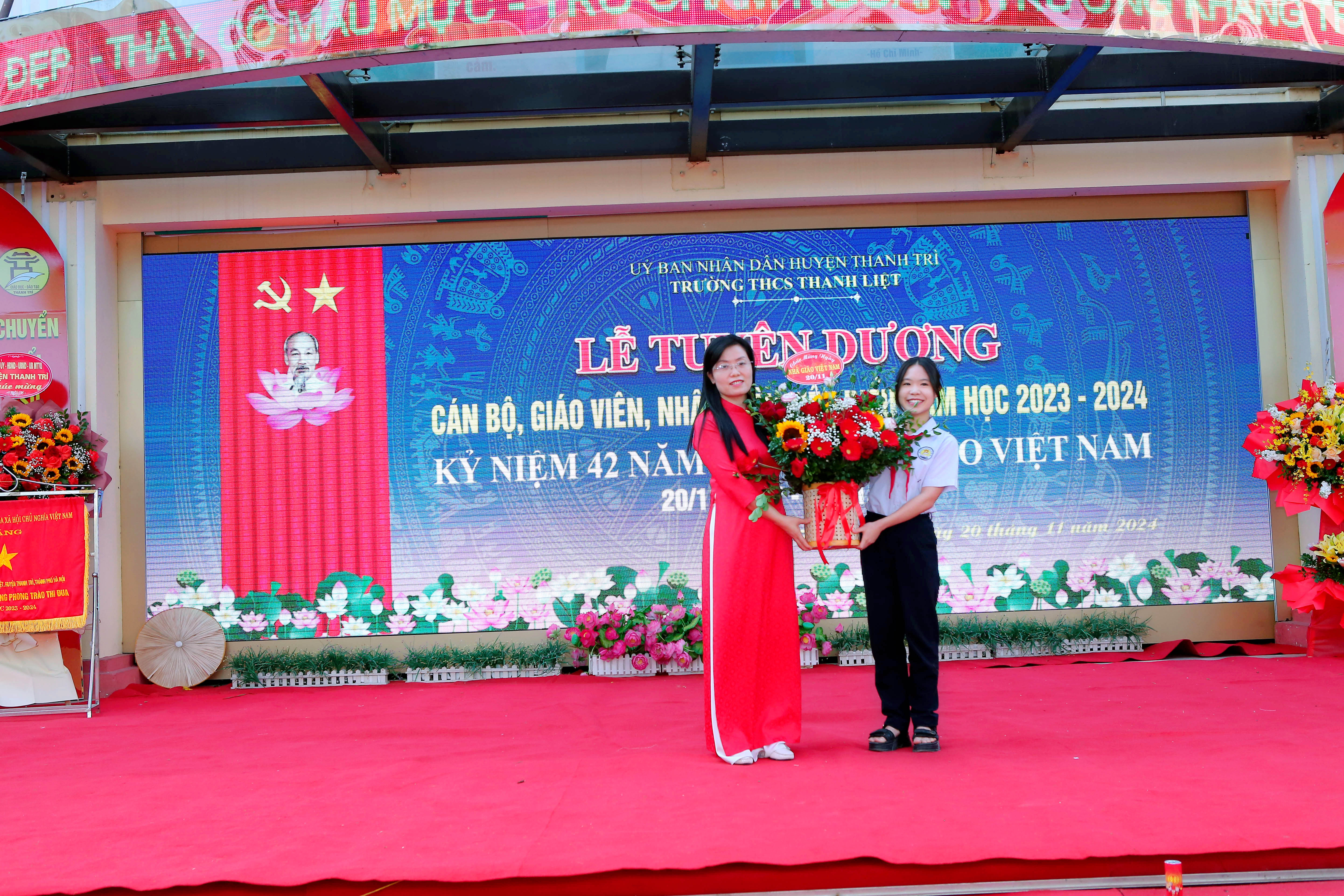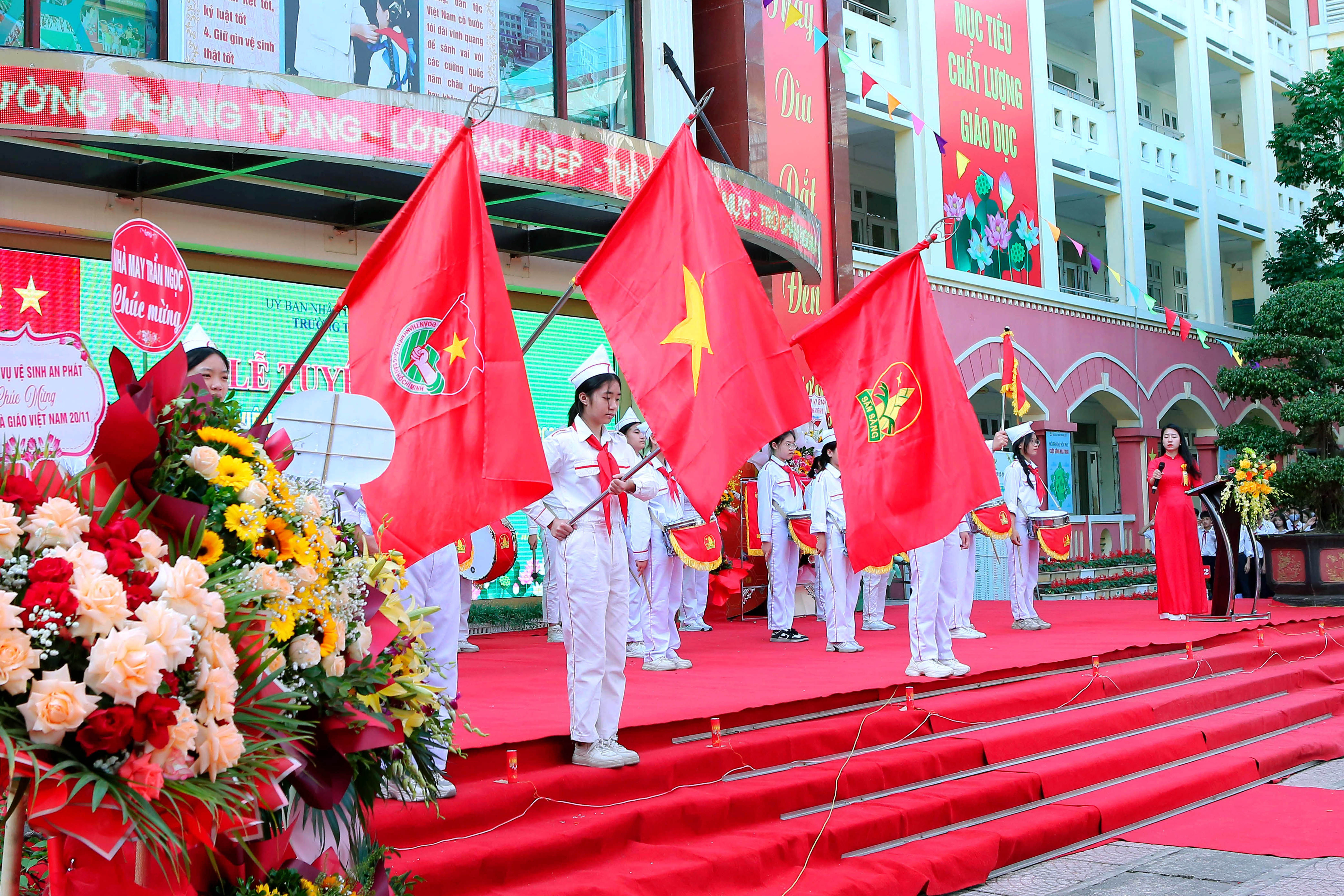 * Buổi lễ còn là dịp để học sinh thể hiện tình cảm và sự tôn trọng đáng quý của các em đối với các thầy cô giáo. Em Nguyễn Minh Châu, lớp 7D1 đại diện cho các bạn học sinh toàn trường đã bày tỏ lòng biết ơn sâu sắc tới các thầy cô, cùng nhau hứa cố gắng học tập và rèn luyện thật tốt để không phụ lòng của thầy cô. Các em đã dành tặng những đóa hoa tươi thắm để tri ân công lao dạy dỗ của thầy, cô.