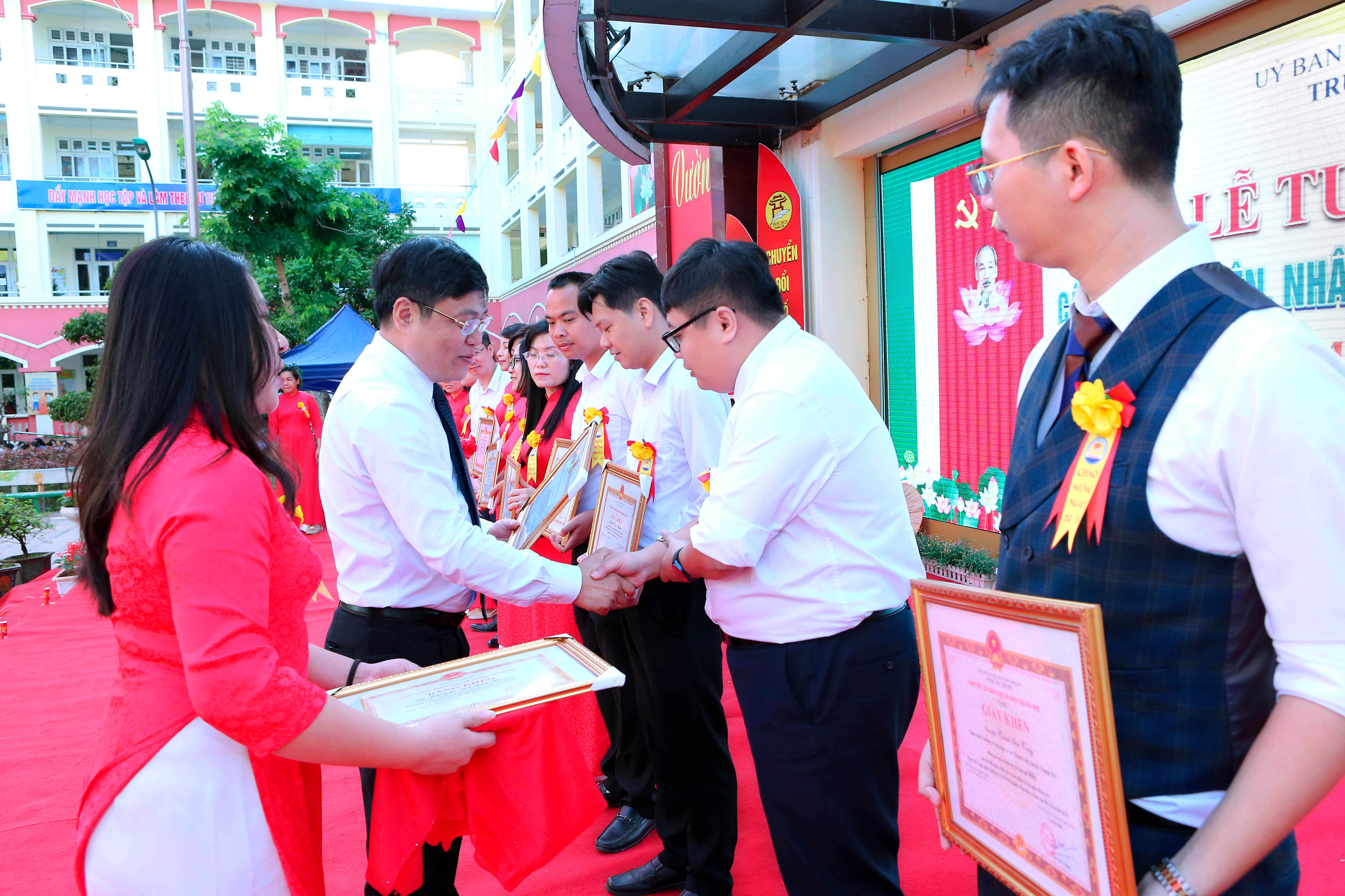 * Trong không khí trang nghiêm của buổi lễ, trường còn tổ chức khen thưởng các thầy cô nhận Bằng khen của Bộ GD&ĐT, của UBND Thành phố Hà Nội, các thầy cô đạt danh hiệu “Chiến sĩ thi đua cơ sở”, danh hiệu “Nhà giáo tâm huyết, sáng tạo”. Bên cạnh đó, nhà trường đã tặng thưởng cho các tập thể lớp có thành tích trong đợt thi đua.