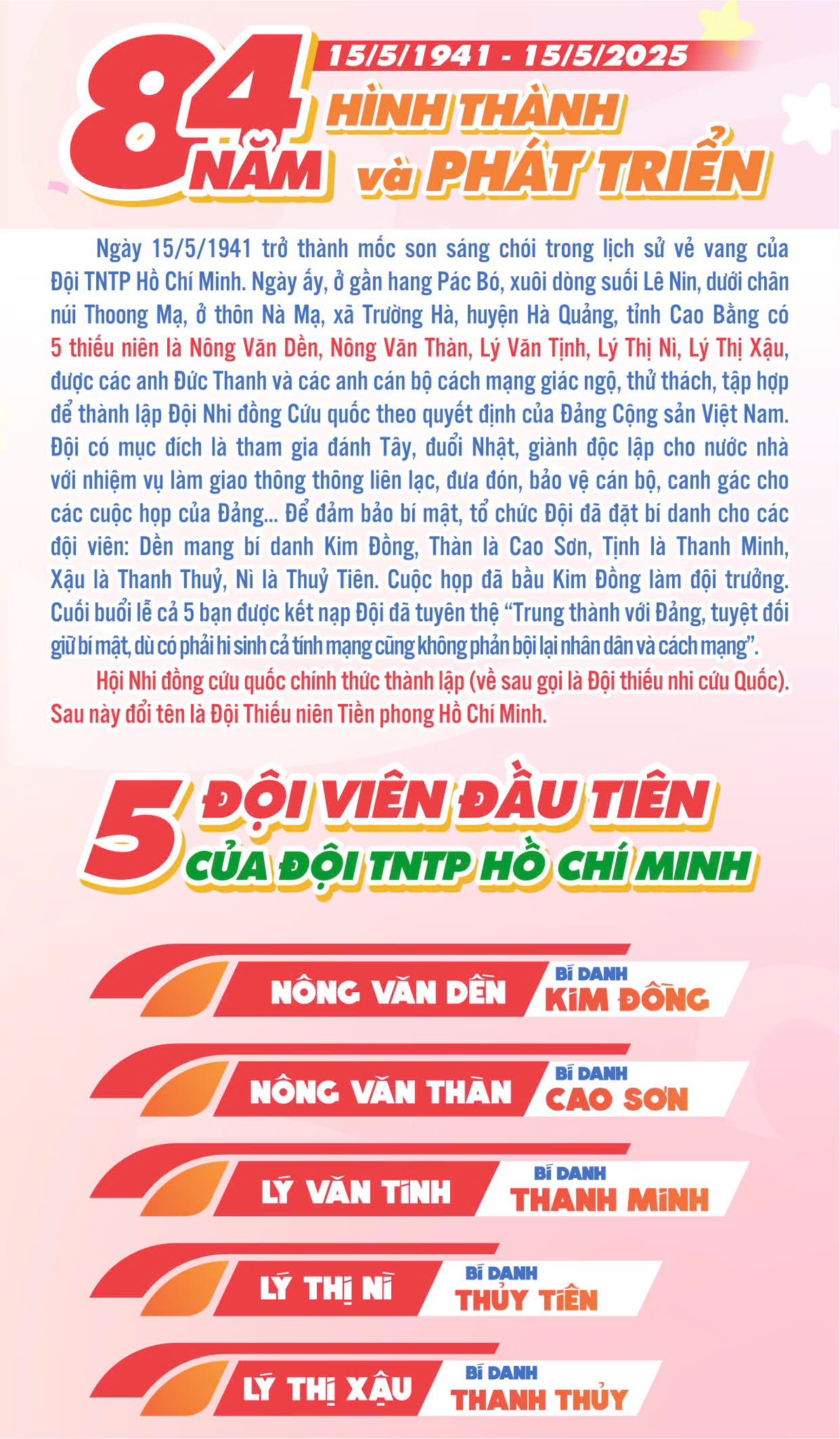 Lần đầu tiên, Đại hội Cháu ngoan Bác Hồ được tổ chức đúng vào dịp kỷ niệm 84 năm ngày thành lập Đội TNTP Hồ Chí Minh (15/5/1941 - 15/5/2025). Hãy cùng nhìn lại chặng đường 84 năm “Đội ta lớn lên cùng đất nước”.