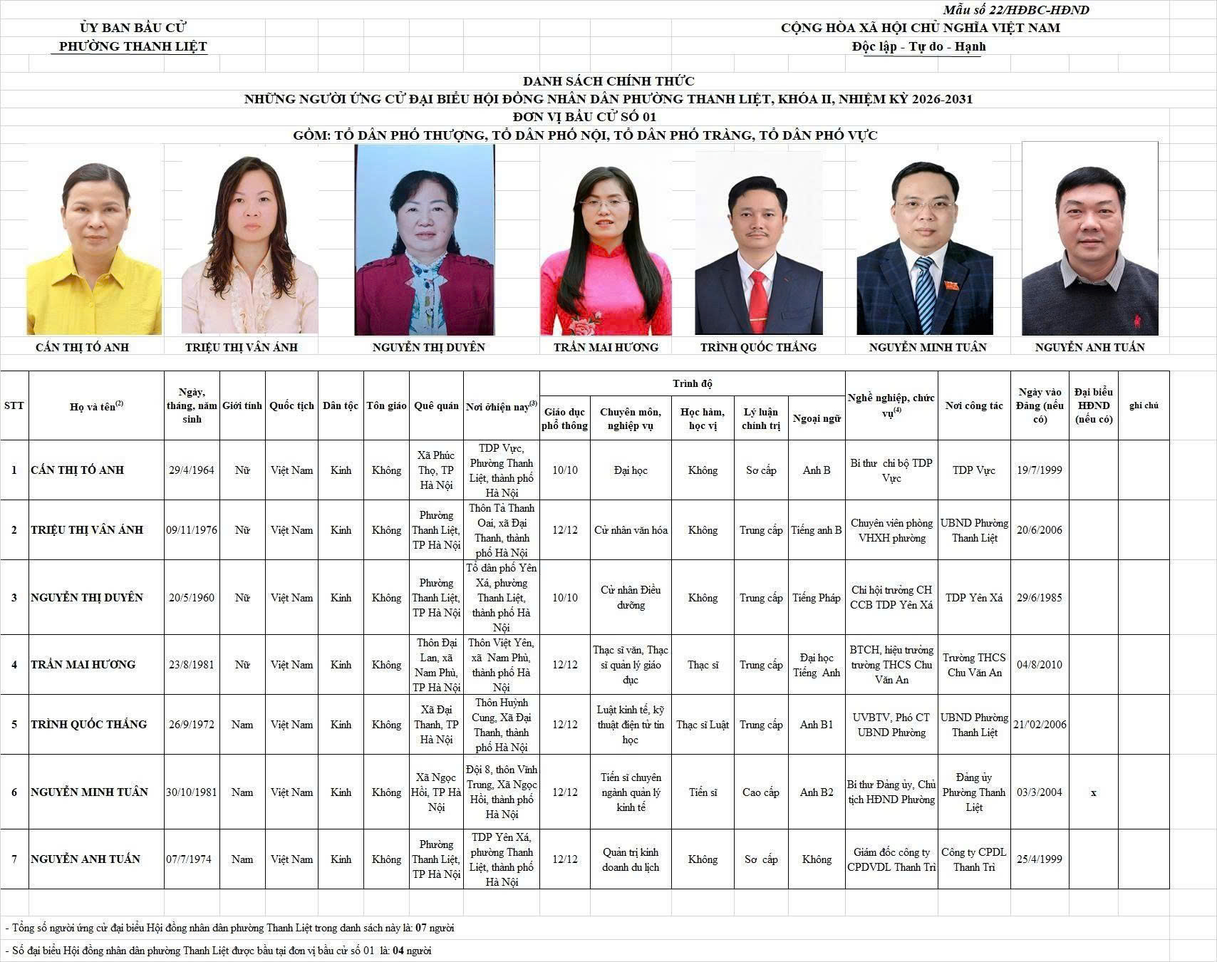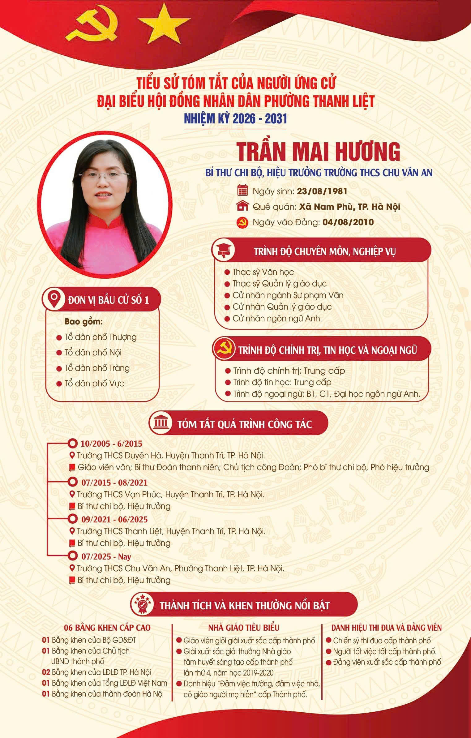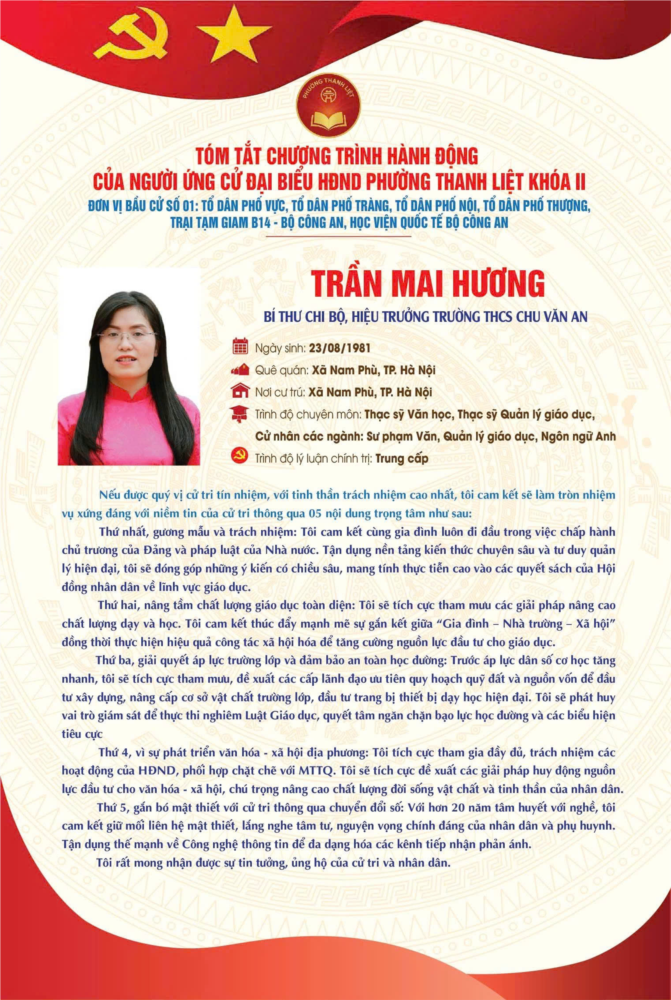 Tập thể cán bộ, giáo viên, nhân viên và học sinh Trường THCS Chu Văn An trân trọng chia sẻ tin vui và chúc mừng đồng chí Trần Mai Hương – Bí thư Chi bộ, Hiệu trưởng nhà trường – tham gia ứng cử Đại biểu Hội đồng nhân dân phường Thanh Liệt Khóa II, nhiệm kỳ 2026–2031, tại Đơn vị bầu cử số 01 – Phường Thanh Liệt gồm các Tổ dân phố thôn Thượng, Tổ dân phố Nội, Tổ dân phố Tràng, Tổ dân phố Vực.