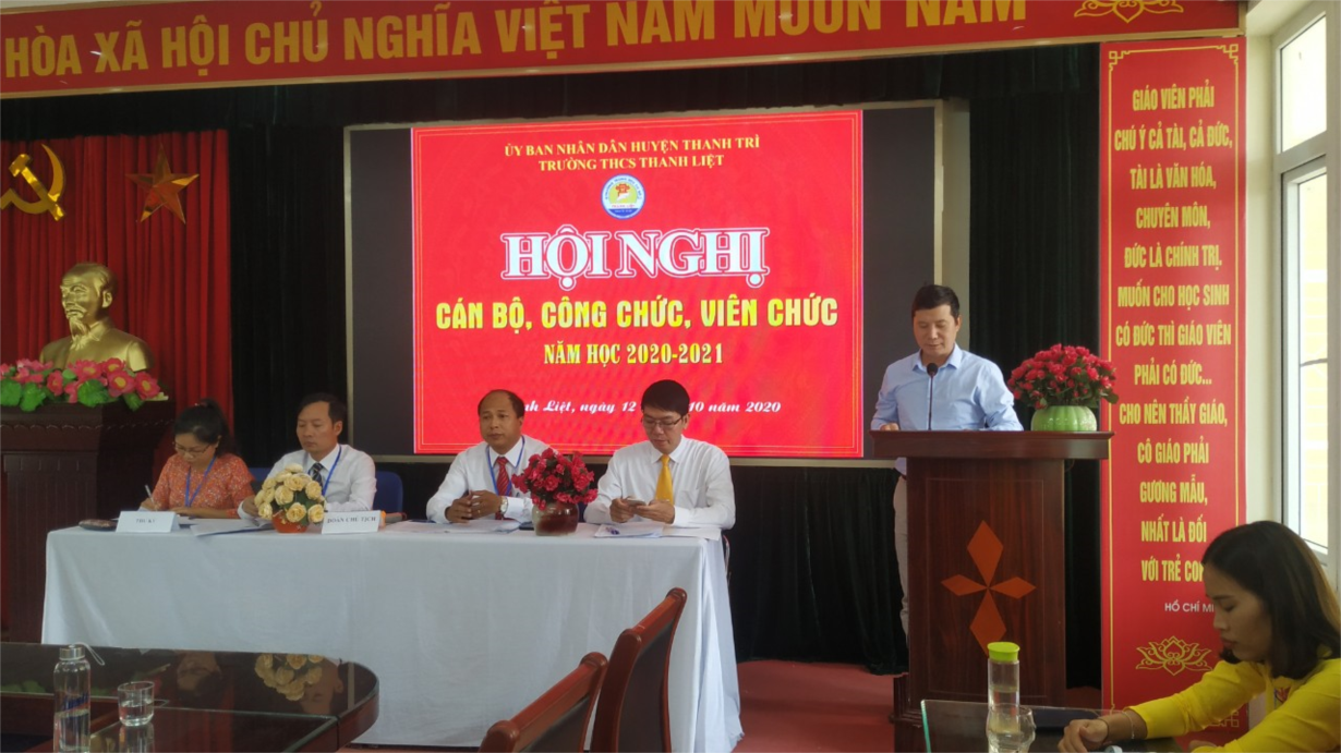 Ngày 12/10/2020 trường THCS Thanh Liệt đã long trọng tổ chức hội nghị cán bộ viên chức năm học 2020-2021. Dự và chủ trì hội nghị có đ/ c Phạm Văn Ngát bí thư chi bộ, hiệu trưởng nhà trường, đ/c Nguyễn Xuân Thành Phó bí thư chi bộ, Phó hiệu trưởng nhà trường, đ/c Chử Thanh Minh Phó Hiệu trưởng nhà trường và đ/c Đào Xuân Kiên chủ tịch Công Đoàn trường và toàn bộ cán bộ nhân viên chức nhà trường về dự đông đủ. Đến dự với hội nghị còn có đ/c Dũng đại diện công đoàn Huyện Thanh trì về dự và đ/c Phong đại diện bên xã Thanh Liệt về dự cùng hội nghị.