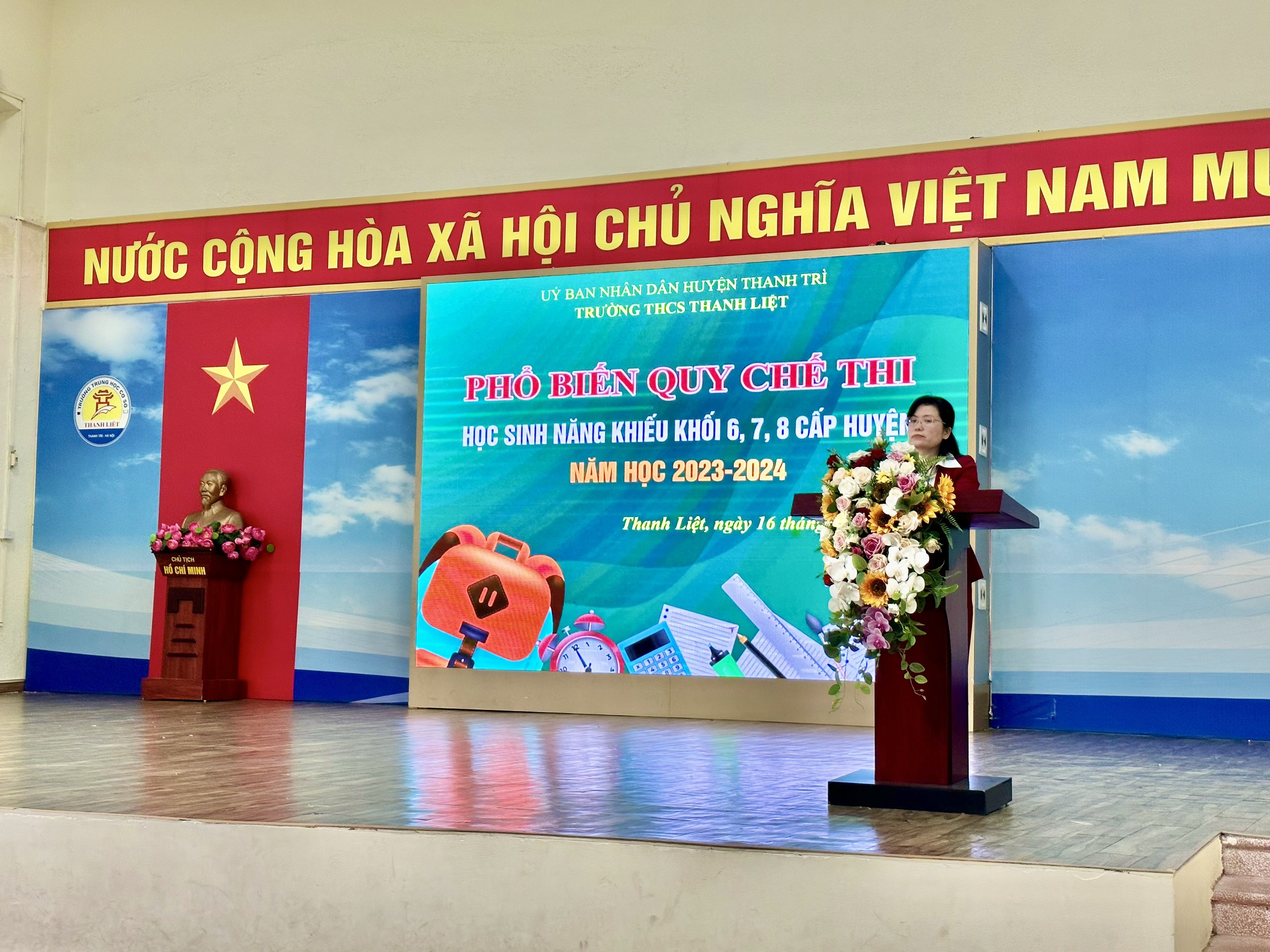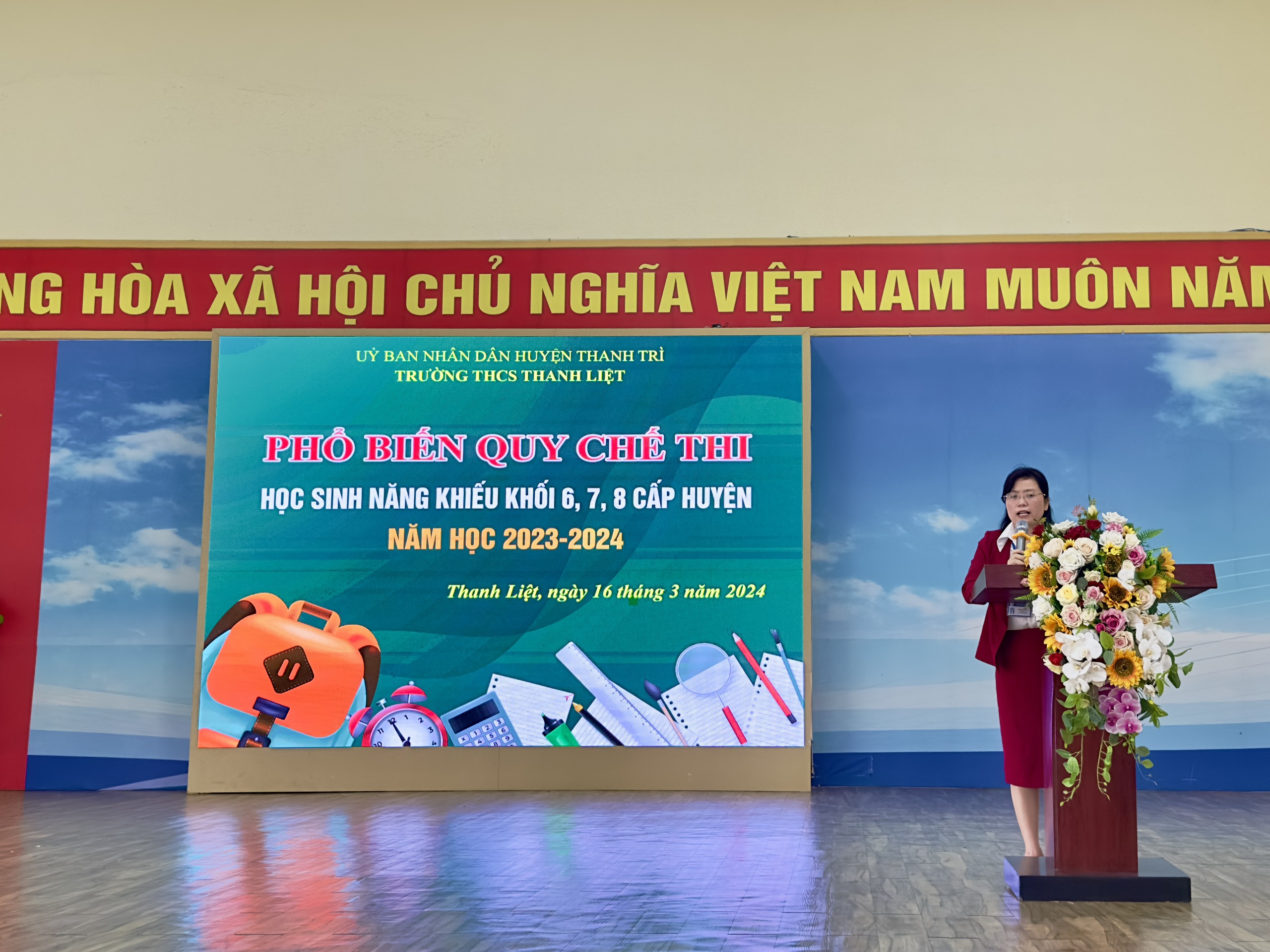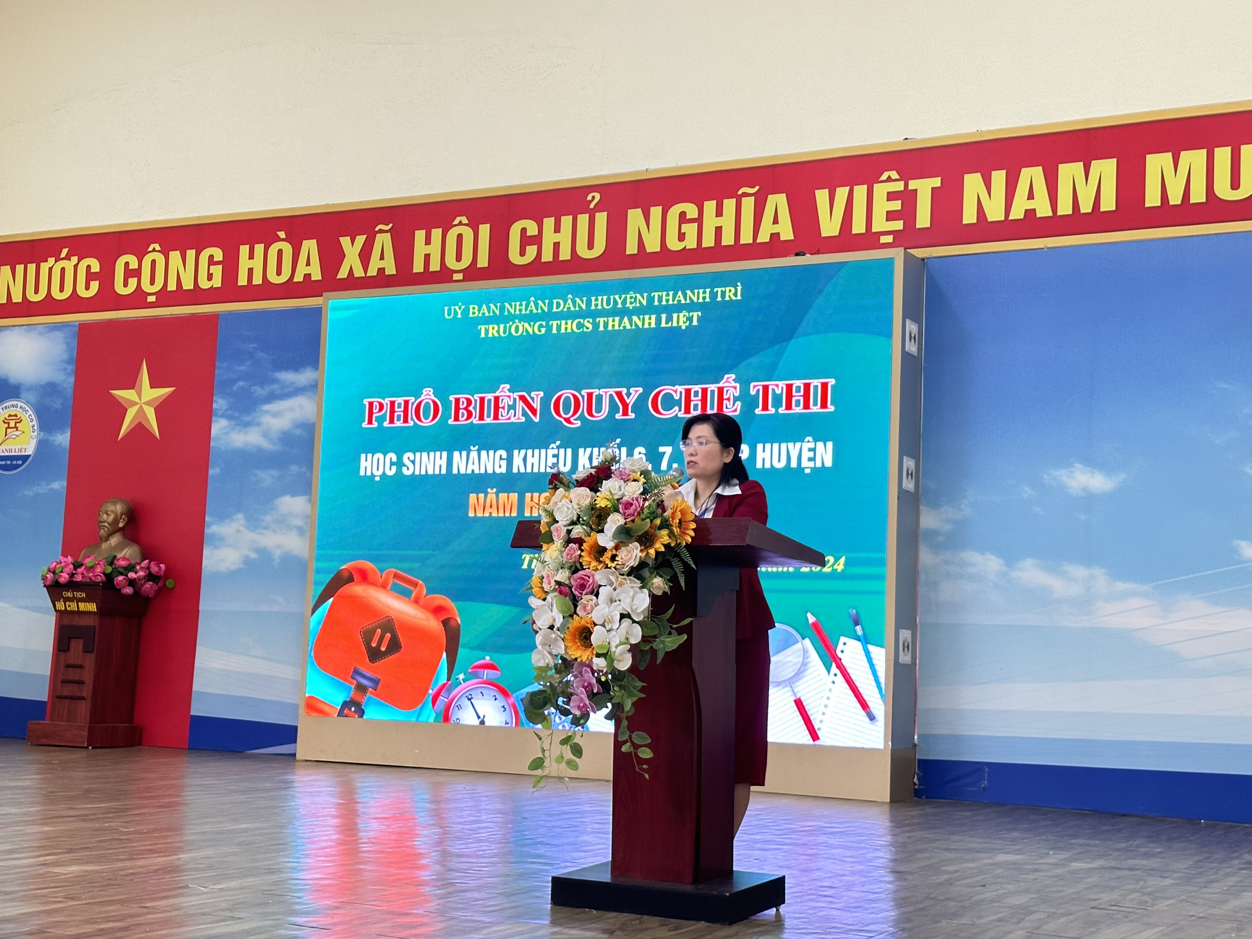 Mở đầu cho buổi gặp mặt đầy ý nghĩa, cô giáo Trần Mai Hương- Hiệu trưởng của nhà trường đã có lời phát biểu động viên, dặn dò các em học sinh về thời gian, địa điểm, kinh nghiệm, kỹ năng và quy chế làm bài thi. Những lời dặn dò thực sự cởi mở, chân tình của cô đã truyền cho các em ý chí quyết tâm và sự cố gắng hết mình cho cuộc thi sắp tới.