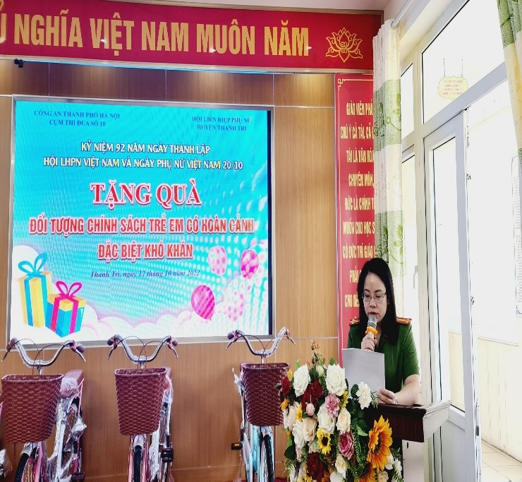 Hòa chung không khí kỷ niệm ngày thành lập hội liên hiệp Phụ nữ Việt Nam 20/10, thực hiện chương trình thi đua của Cụm thi đua số 10 CATP Hà Nội và Hội liên hiệp phụ nữ huyện Thanh Trì với ý nghĩa tuyên truyền nâng cao truyền thống cách mạng vẻ vang của Đảng, ngành và truyền thống Thủ đô ngàn năm văn hiến, phát huy tinh thần tương thân tương ái, lá lành đùm lá rách, chia sẻ cùng chung tay chăm lo các cháu mổ côi có hoàn cảnh khó khăn, Cụm thi đua số 10 CATP Hà Nội và Hội Liên hiệp phụ nữ huyện Thành Trì đã tổ chức tặng quà cho các cháu có hoàn cảnh khó khăn trên địa bàn huyện tại trường THCS Thanh Liệt.