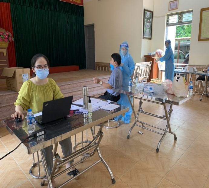 Đồng chí Hoàng Thị Trâm và Nguyễn Đức Phú hỗ trợ nhập dữ liệu Covid – 19